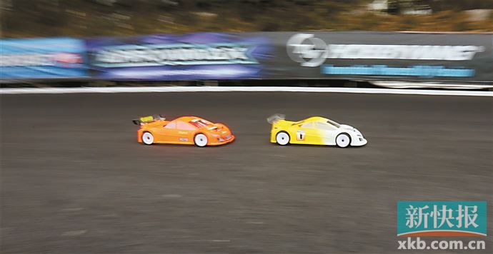 ■黄白色的遥控车在飞腾赛车场的赛道上飞驰。