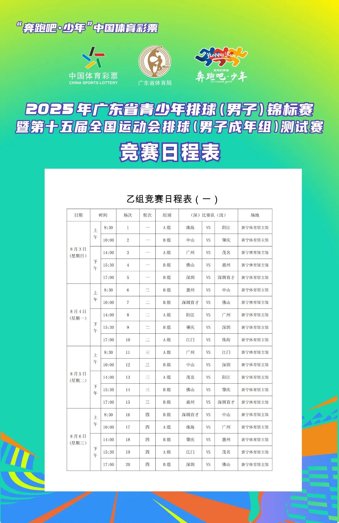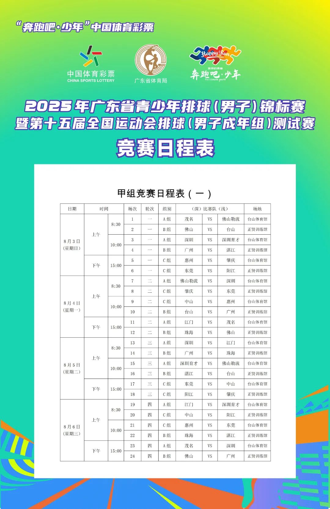 8月3日,2025年广东省青少年排球(男子)锦标赛暨第十五届全国运动会排球(男子成年组)测试赛在台山新宁体育馆、台山体育馆开赛。