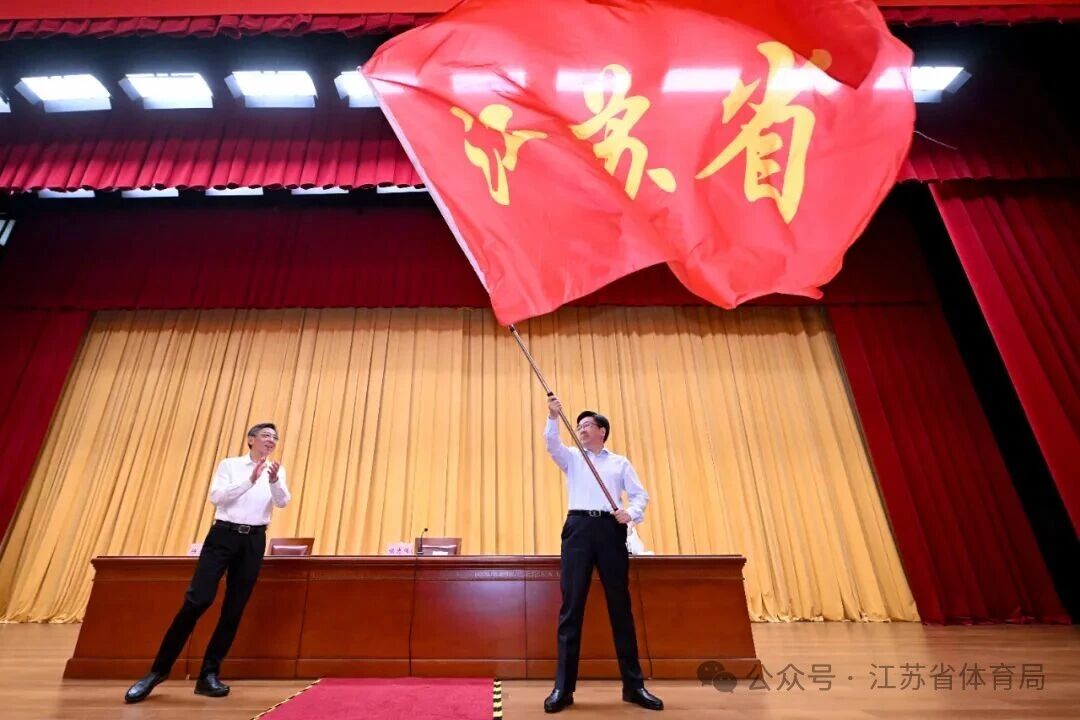 10月11日上午,第十五届全国运动会江苏省体育代表团成立大会在南京举行。江苏省副省长、代表团团长陈忠伟为代表团授旗并讲话。江苏省省政府副秘书长徐华勤主持会议。