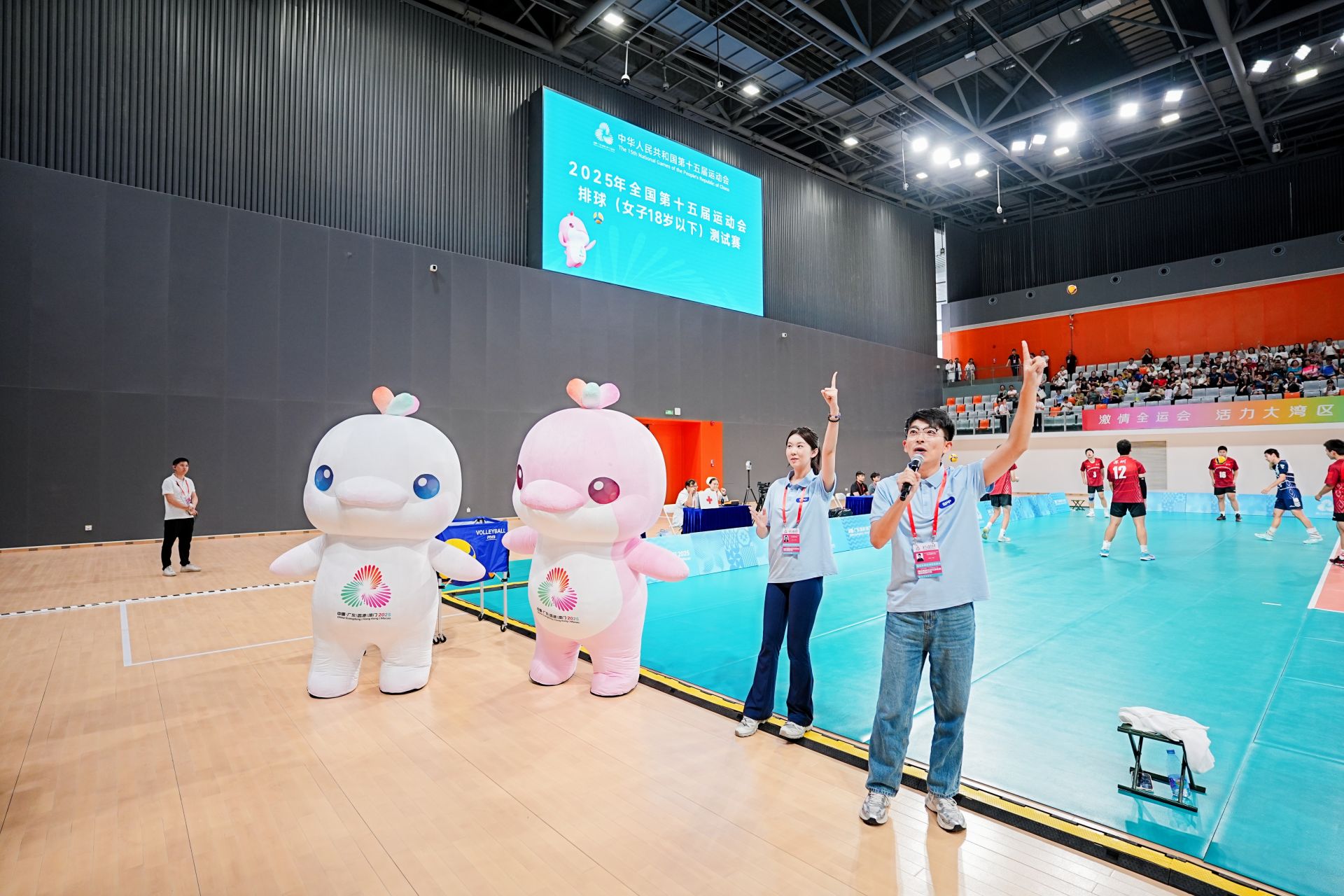 ▲十五运会吉祥物亮相测试赛现场,与观众欢乐互动。