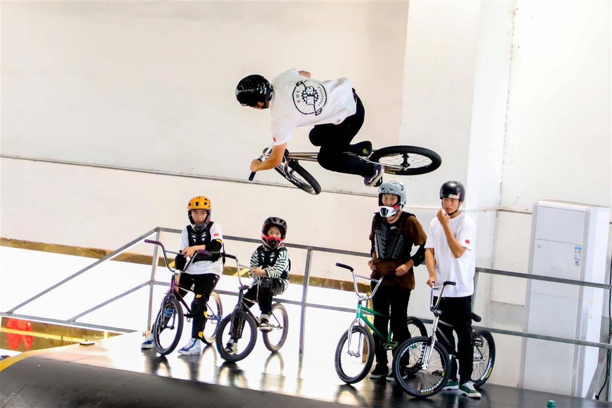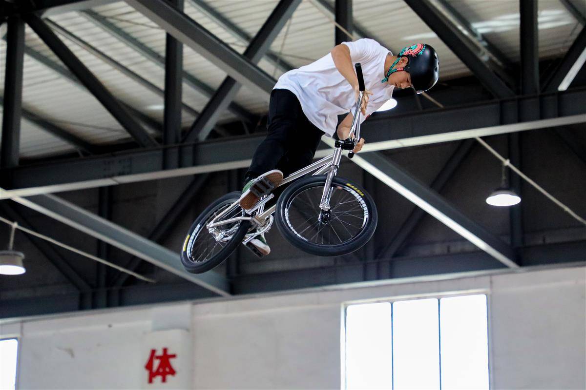 几位不到二十岁的年轻队员,骑在小小的自行车上,从几米高的看台上一冲而下,凭借着冲劲冲上陡坡飞向空中,带着少则十几斤多则几十斤的小车在空中做出种种酷炫惊险的动作,然后稳稳地落回地面。别说亲自骑上去体验,就是站在一旁看着他们在空中翻滚,普通人的心脏都要跳出来了。
