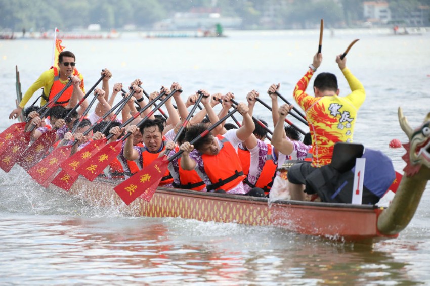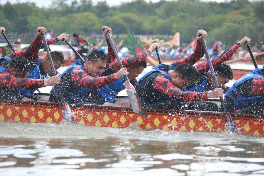 龙舟队员们挥桨斩浪,全力以赴,上演水上“速度与激情”。