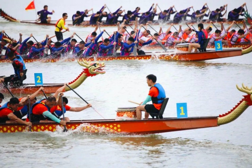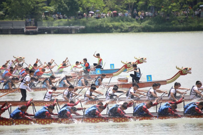 只见湖面上鼓声震天,桨影翻飞!一条条龙舟如箭般飞驰,选手们手持木桨,随着鼓点的节奏,动作整齐划一。