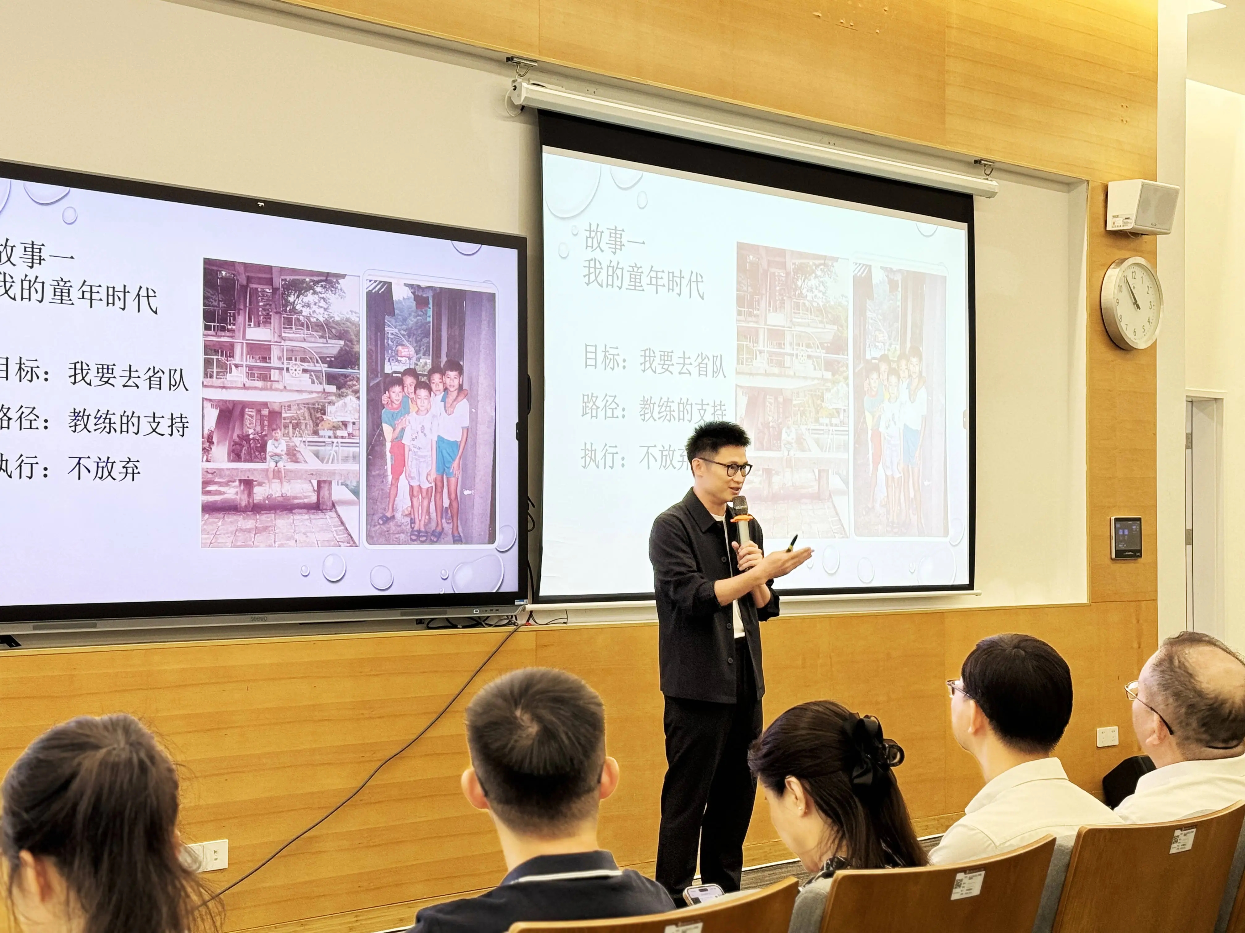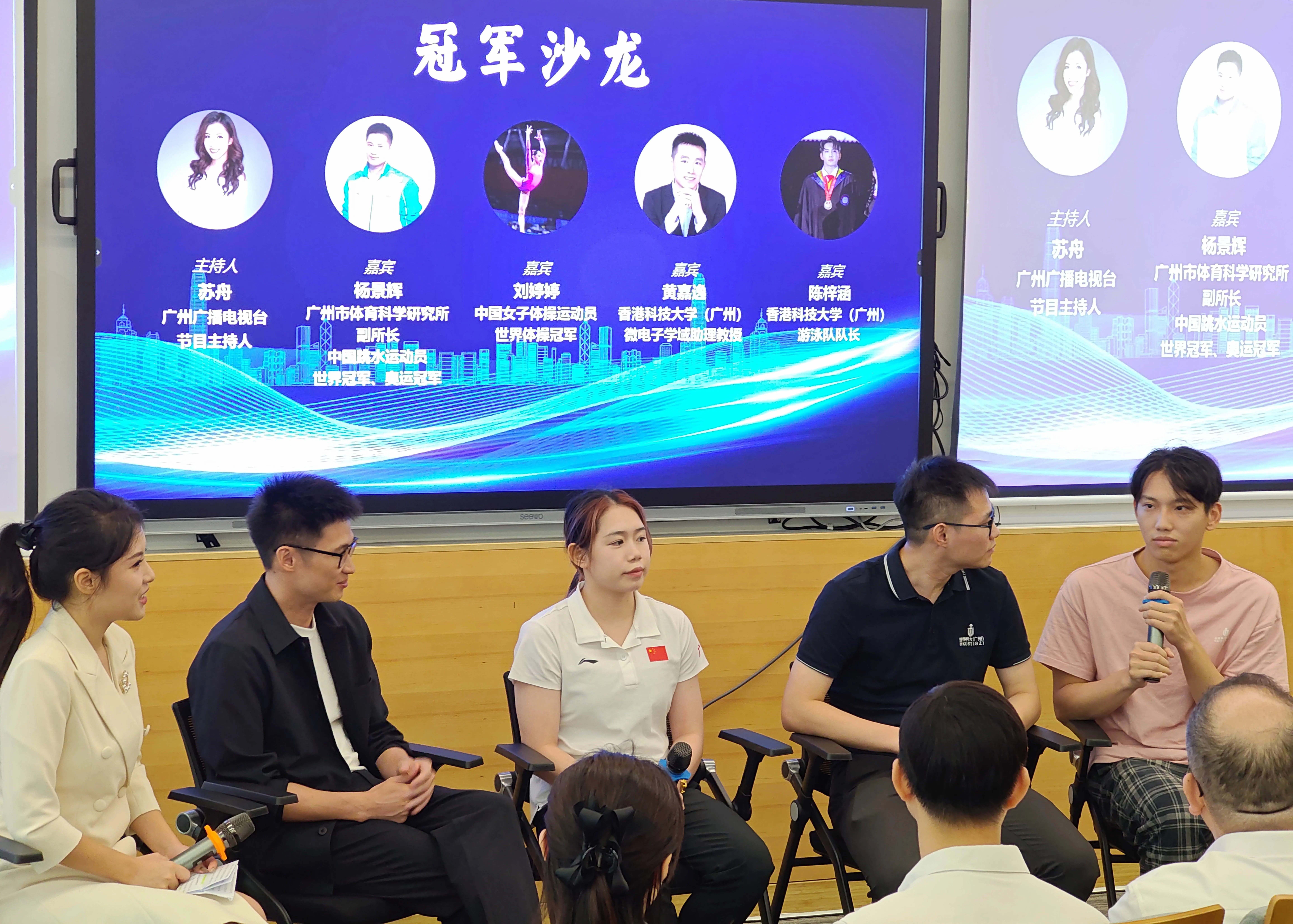 分享环节后,冠军代表杨景辉、刘婷婷,科研界代表港科大(广州)微电子学域助理教授黄嘉逸、港科大(广州)游泳队长陈梓涵与同学们零距离交流。他们通过分享自己在挫折和坚持中涅槃的故事,用“每天运动一小时、健康工作五十年、幸福生活一辈子”的运动格言激励同学们高质量统筹好学习和运动的关系,朝着梦想和目标努力前行、乘风破浪。