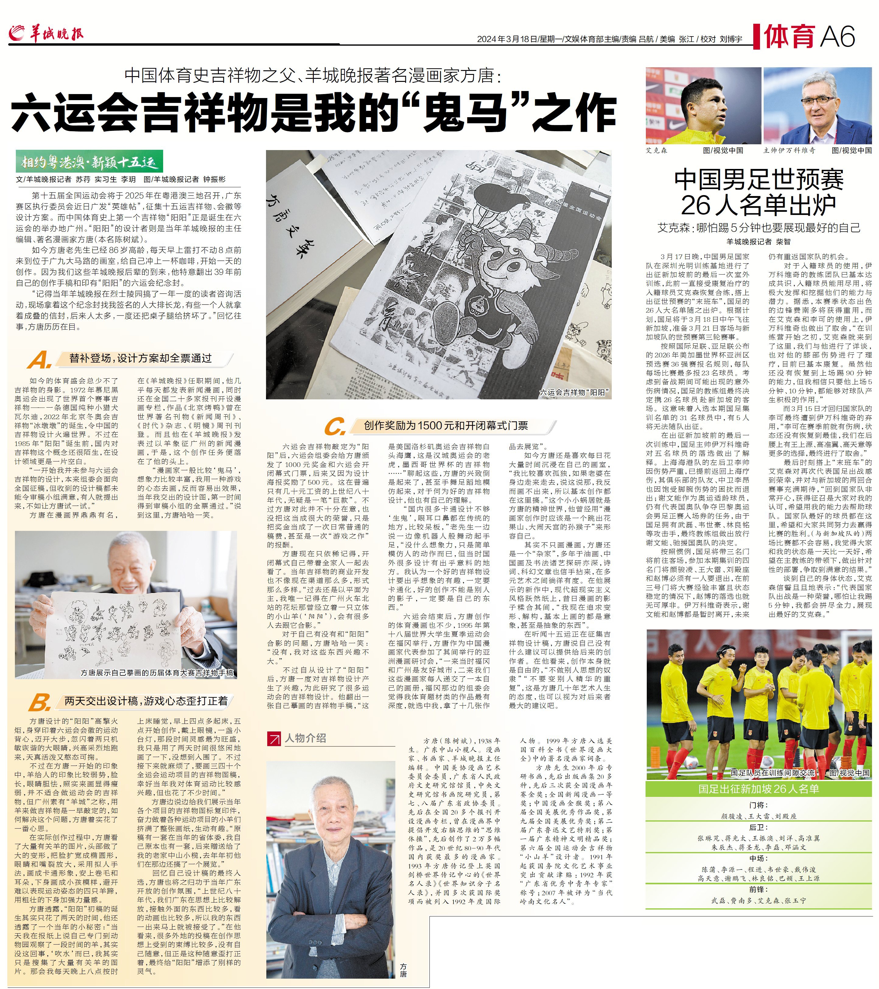 第十五届全国运动会将于2025年在粤港澳三地召开,广东赛区执行委员会近日广发“英雄帖”,征集十五运吉祥物、会徽等设计方案。而中国体育史上第一个吉祥物“阳阳”正是诞生在六运会的举办地广州。“阳阳”的设计者则是当年《羊城晚报》的主任编辑、著名漫画家方唐(本名陈树斌)。