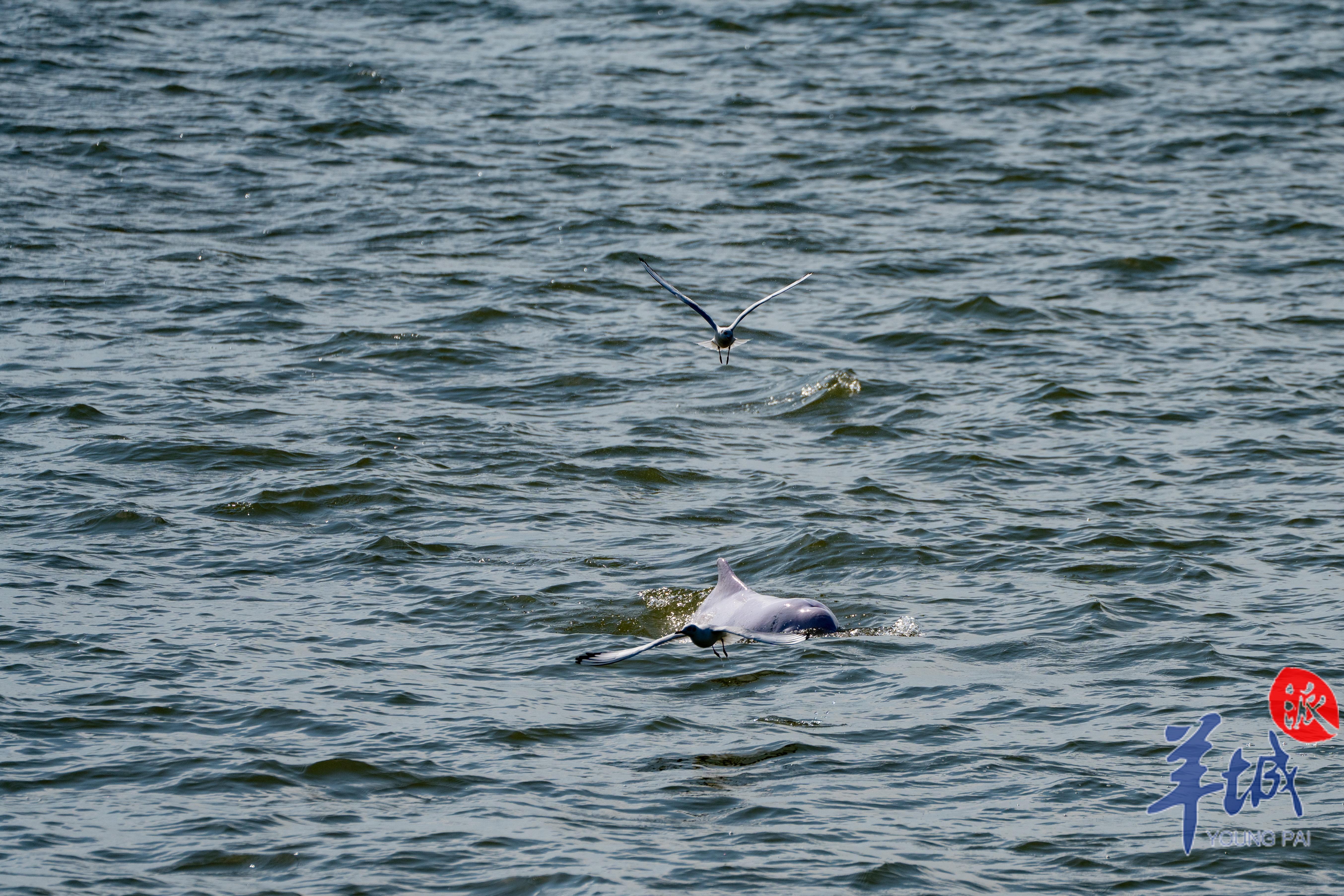 中山市深中通道附近水域,一只海鸥正在追逐中华白海豚。