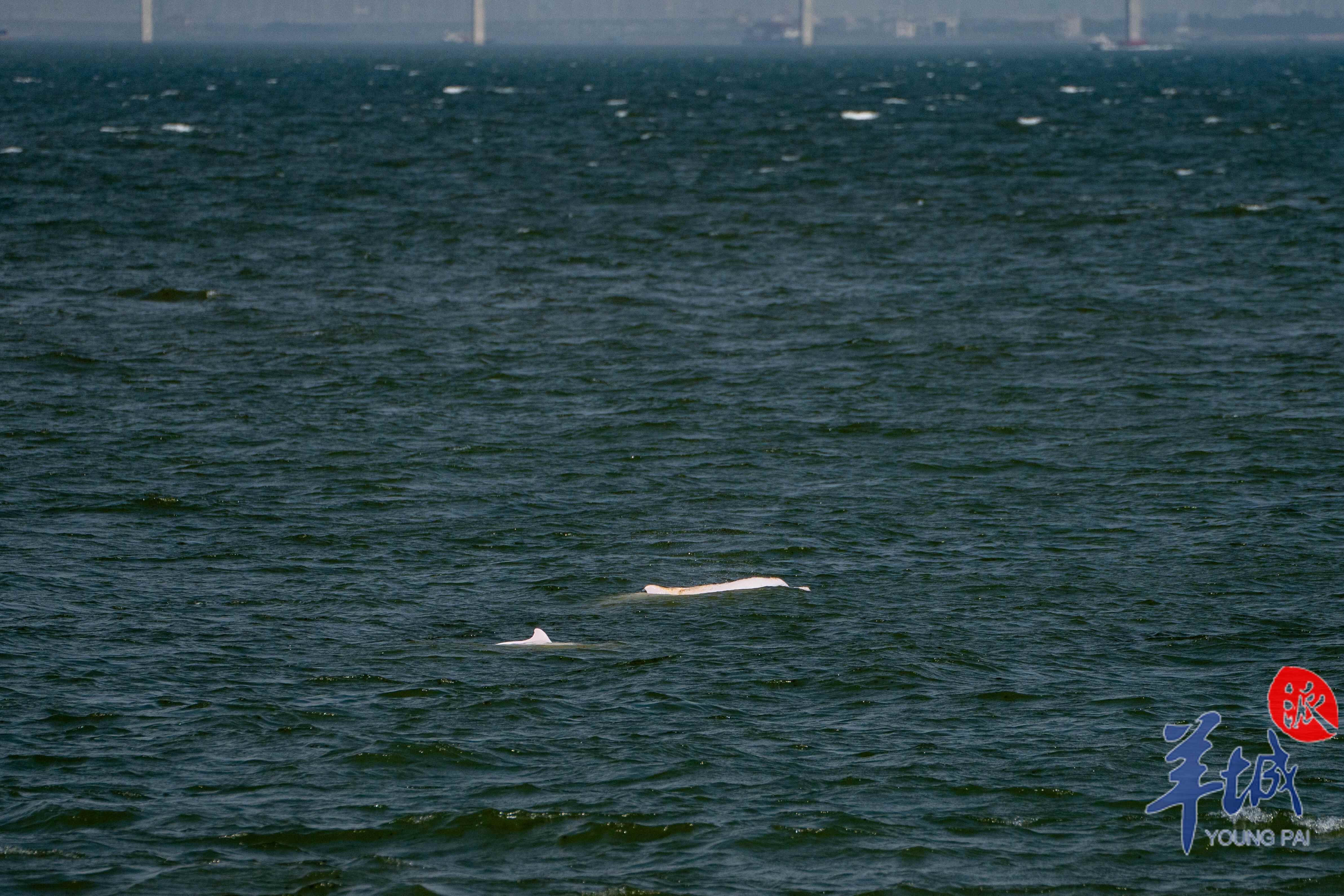 中山市深中通道附近水域,两只中华白海豚正在嬉戏,不远处便是深中通道大桥。