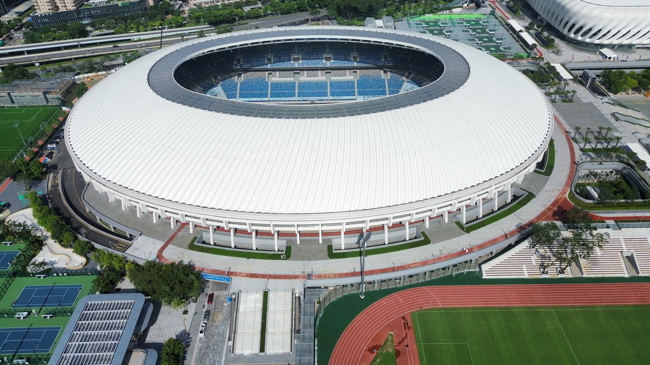 深圳市体育中心体育场位于深圳市福田中心区,东临上步北路、西接泥岗西路、南侧面向笋岗西路。体育场按大型场规模设计,总建筑面积约7万平方米,可提供约4.2万个座席。首层设置赛事媒体区、VIP区、赛事运营区、安全保障区、运动员区等功能区域,分区明确、互不干扰,保障赛事的顺利举办。二层为观众活动区,观众可经由室外大台阶步入二层观众入口大厅,最终抵达各自座席区。三层为包厢层,包厢层可通过自动扶梯和垂直电梯便捷到达。四层为高区看台层,功能设置与二层类似。五层主要布置声、光、大屏幕等专业控制用房。本场馆为十五运会和残特奥会共用场馆,承办十五运会竞体项目足球(男子20岁以下组)、足球(男子18岁以下组)、射箭和残特奥会射箭(残奥聋奥)赛事。