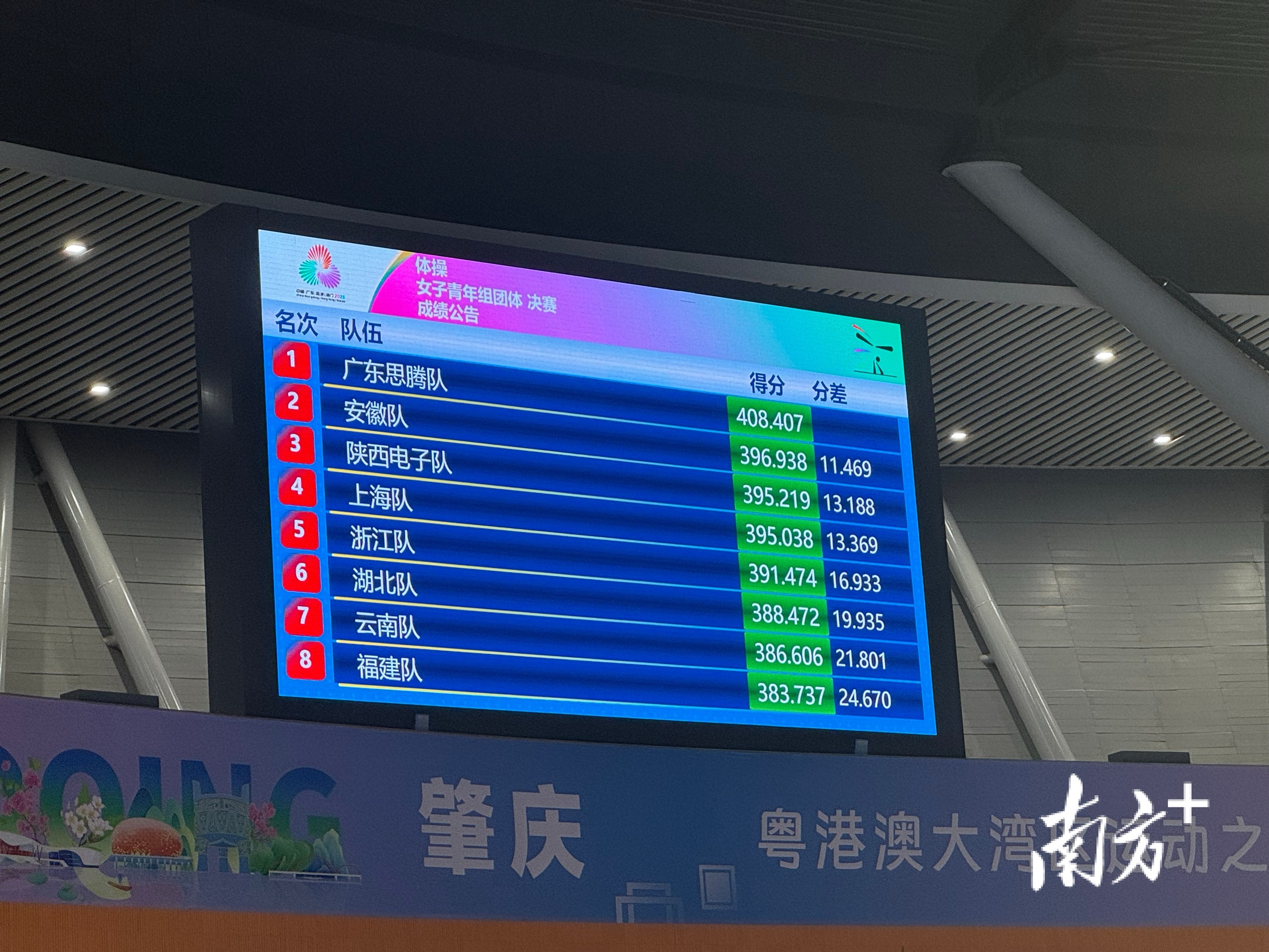 9月8日晚上,第十五届全国运动会体操青年组女子团体决赛在肇庆新区体育中心拉开战幕。广东队以预赛得分第一的成绩,与安徽、陕西、上海等共8支队伍,开展冠亚季军角逐。最终,广东队以408.407分的成绩夺得本次比赛的金牌,这也是广东省代表团在十五运开赛以来取得的首枚竞体金牌!安徽、陕西、上海、浙江、湖北、云南、福建队分别获得二至八名。