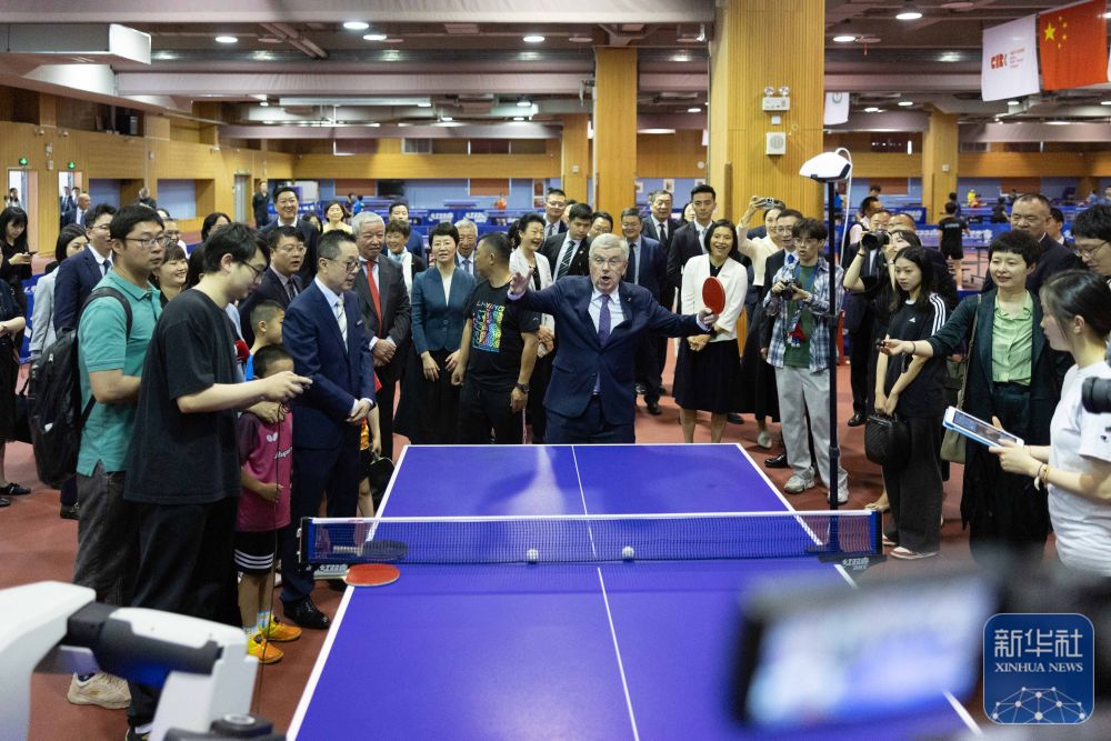 ↑国际奥委会主席巴赫(中)在上海体育大学中国乒乓球学院体验乒乓球机器人。