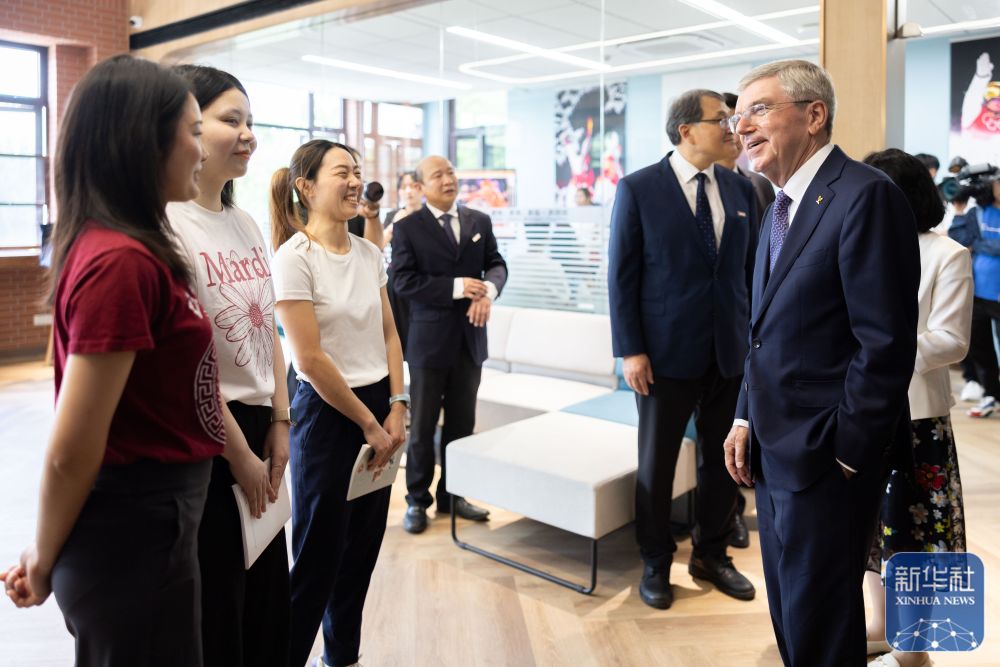 ↑国际奥委会主席巴赫(前右)在上海体育大学奥林匹克研究院与学生交谈。