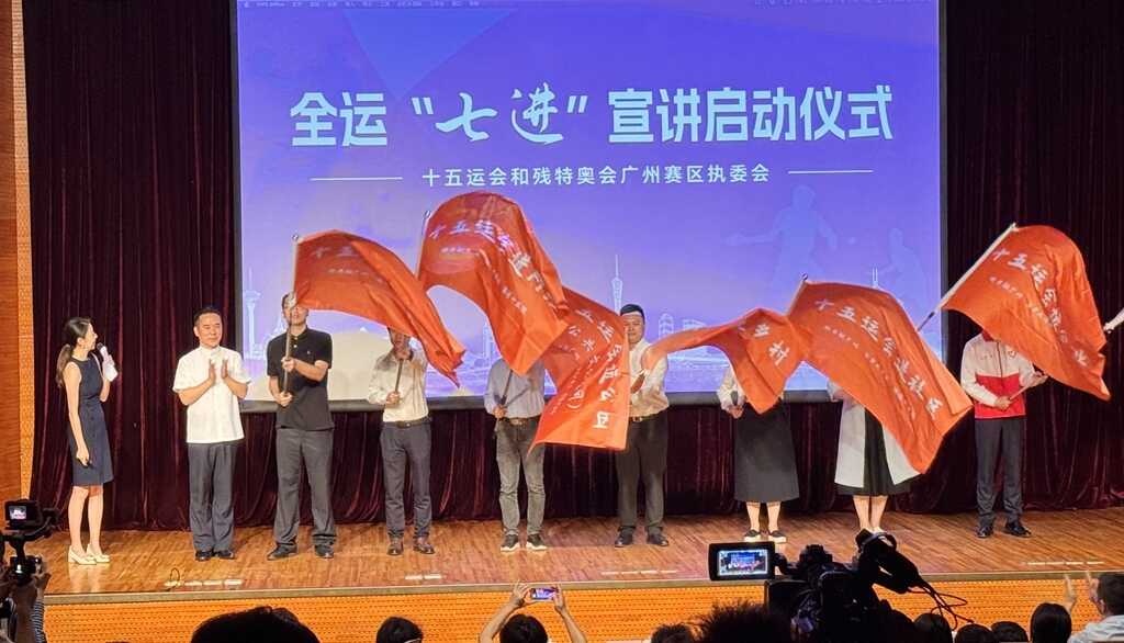 5月6日,全运“七进”宣讲启动仪式在广州图书馆举行,海珠区教育局教师刘思霖、暨南大学大四学生刘嘉熙、华师附中花都学校教师林雪和广东广播电视台体育频道主持人央金先后作了主题宣讲。十五运会和残特奥会广州赛区执委会副主任、广州市政府副秘书长朱小燚等嘉宾出席,并为“七进”活动单位授旗。