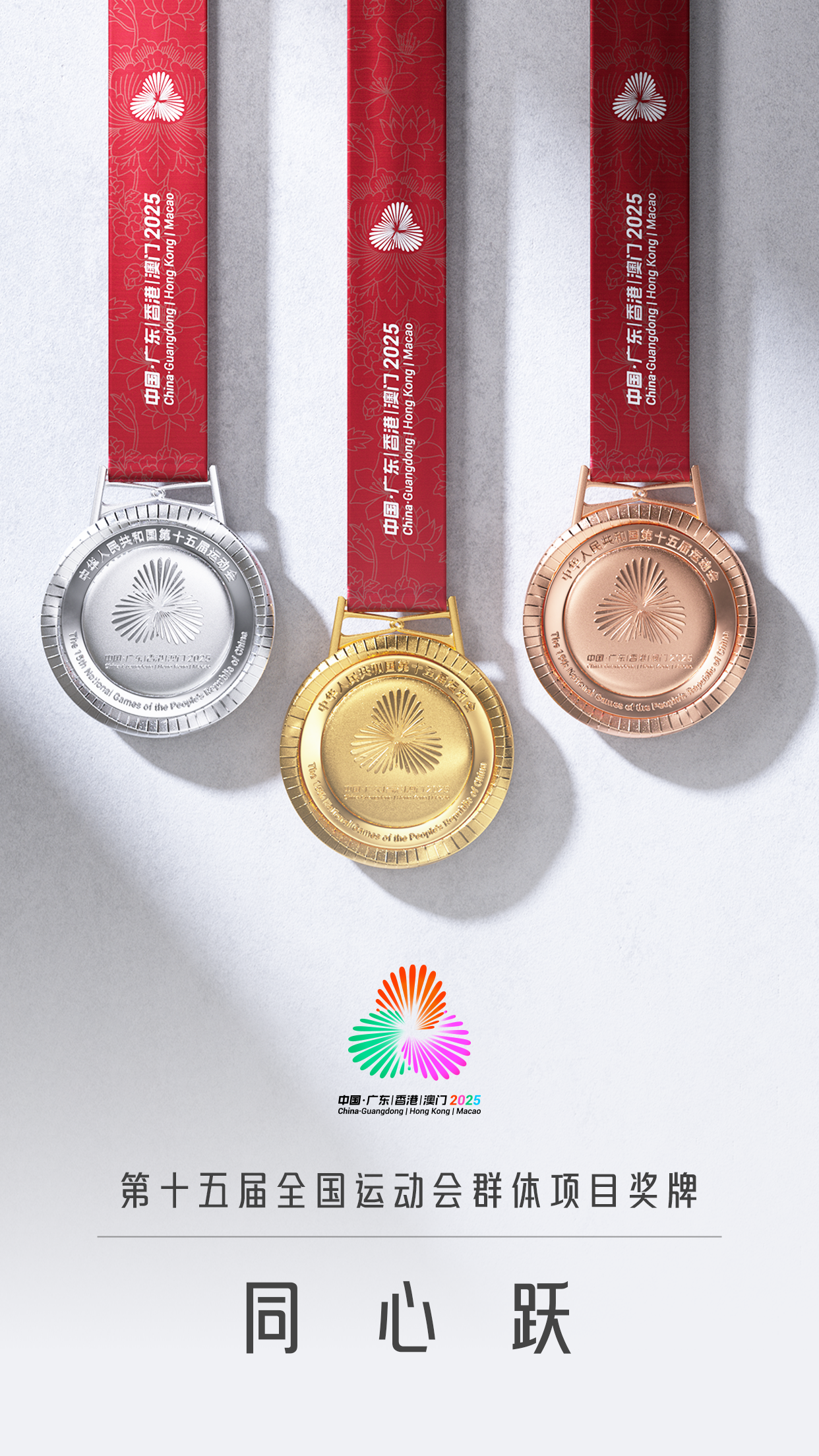 “同心跃”奖牌以匠心设计融合粤港澳大湾区发展脉搏、中华文化底蕴与全运历史传承。竞技体育项目奖牌重354.5 克,一面正中上方的会徽由代表粤港澳三地的花瓣交叠扭转形成同心礼花,下方牡丹花托举而上,寓意粤港澳大湾区依托祖国的坚实后盾蓬勃发展,为民族复兴贡献力量;另一面中间的吉祥物中华白海豚手举火炬,灵动活泼,周围浪涛造型的数字“15”巧妙地将全运会届别与体育精神的传承完美结合。群众赛事活动奖牌重232克,一面刻有会徽和运动会名称,另一面则是吉祥物中华白海豚浮雕及毛泽东同志的题词“发展体育运动 增强人民体质”,充分彰显“全民全运,全运惠民”的理念。奖牌边缘精心雕刻的66道纹路,象征着全运会66年的辉煌历史,挂扣采用港珠澳大桥同心结造型,寓意三地团结一心,绶带以“三花映牡丹”为纹样,尽显粤港澳大湾区的独特风采。