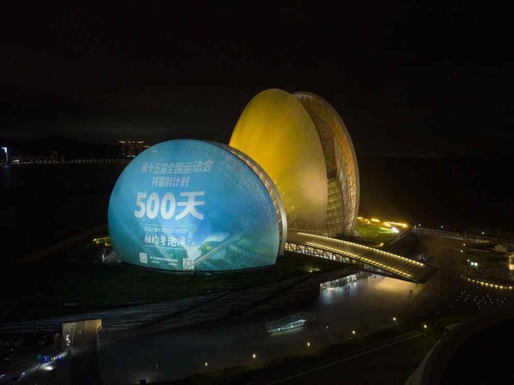 6月27日,珠海在珠海大剧院(日月贝)与横琴总部大厦以别开生面的灯光庆典,迎接第十五届全国运动会倒计时500天的到来。