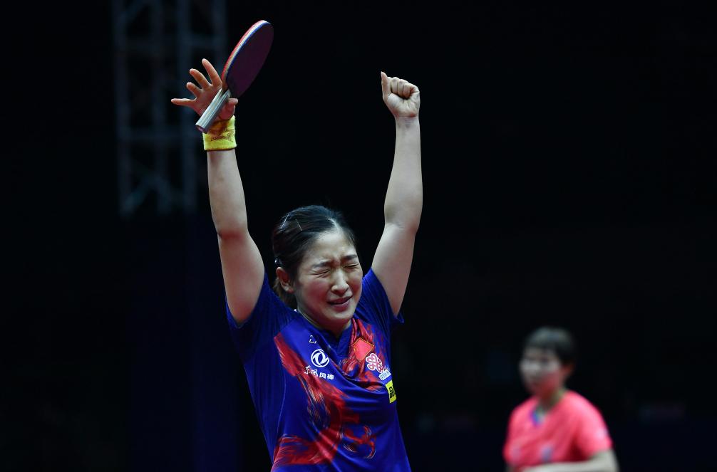 2019年4月27日,在匈牙利布达佩斯举行的2019世界乒乓球锦标赛女单决赛中,刘诗雯以4比2战胜队友陈梦后庆祝夺冠。陶希夷 摄