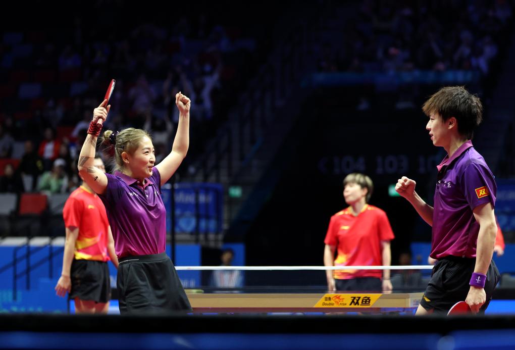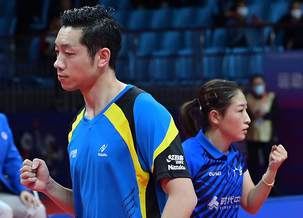 2021年9月24日,联合队组合许昕(左)/刘诗雯在比赛中庆祝。 当日,在陕西延安进行的第十四届全运会乒乓球项目混合双打决赛中,联合队组合许昕/刘诗雯以4比2战胜黑龙江队组合曹巍/王曼昱,获得冠军。李安 摄