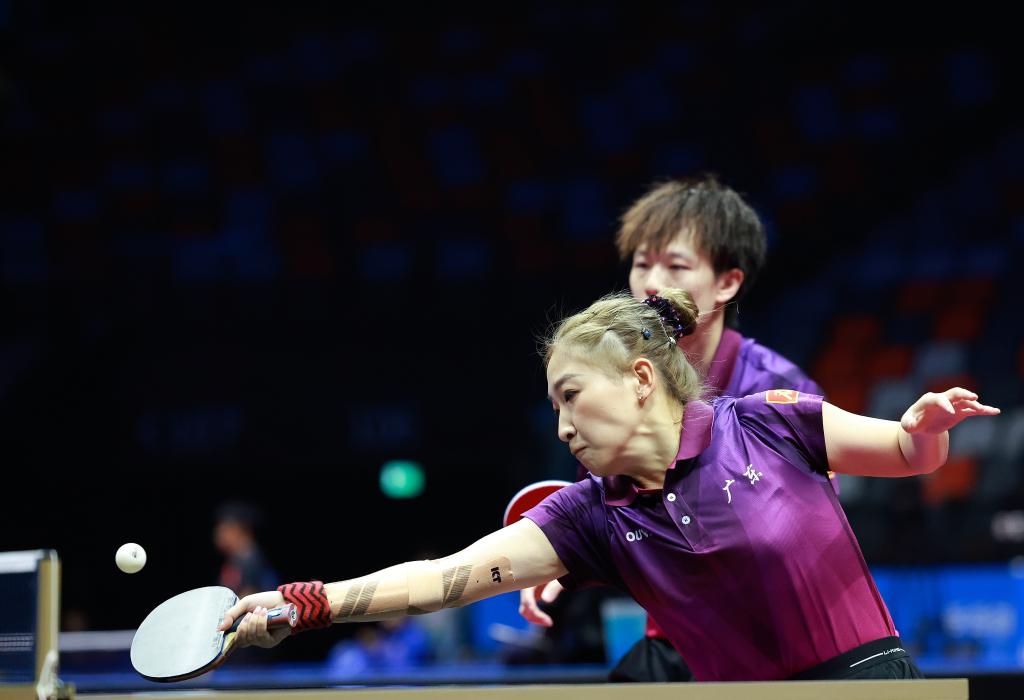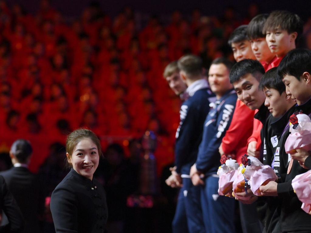 2024年2月25日,国际乒联运动员委员会主席刘诗雯(左)作为颁奖嘉宾出席国际乒联釜山世界乒乓球团体锦标赛男子团体颁奖仪式。陶希夷 摄