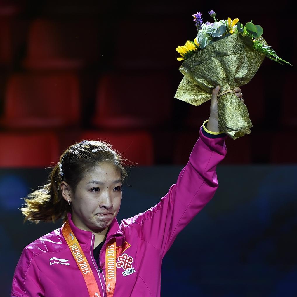 2015年5月2日,获得亚军的刘诗雯在第53届苏州世乒赛女单领奖台上。李响 摄