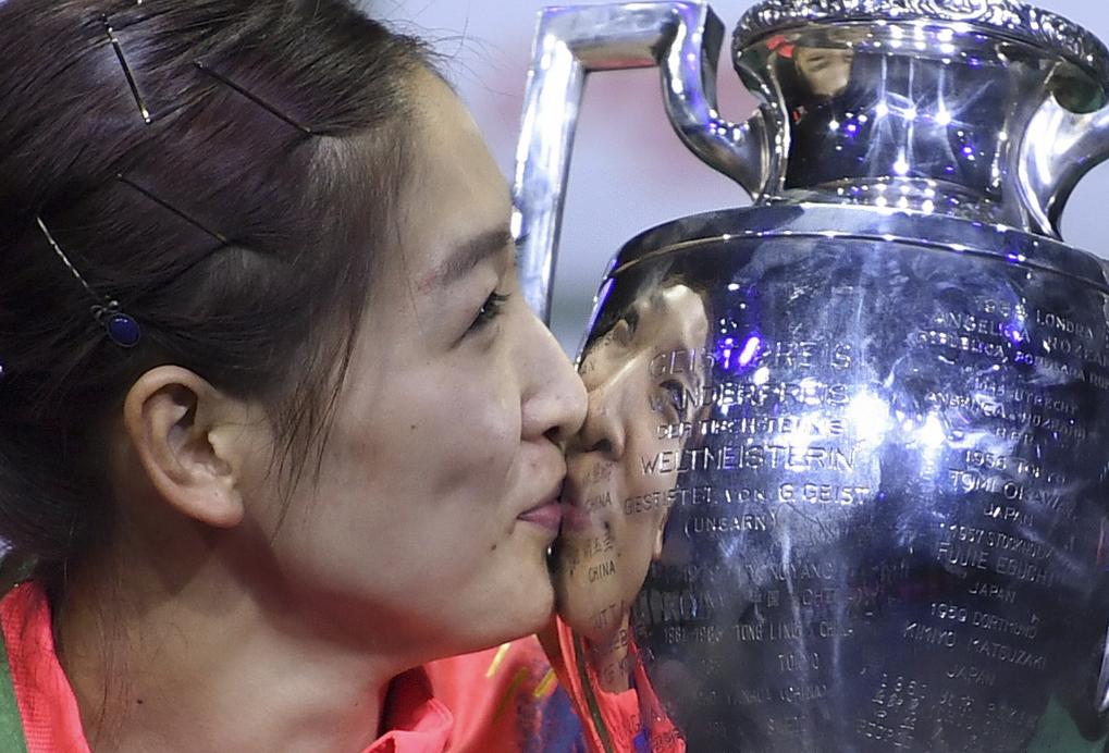 2019年4月27日,刘诗雯在匈牙利布达佩斯世乒赛女单颁奖仪式上亲吻冠军奖杯。逯阳 摄