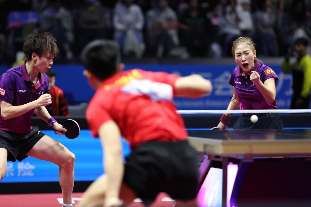 2025年11月13日,林高远/刘诗雯(前)在第十五届全国运动会乒乓球混合双打半决赛中。梁旭 摄