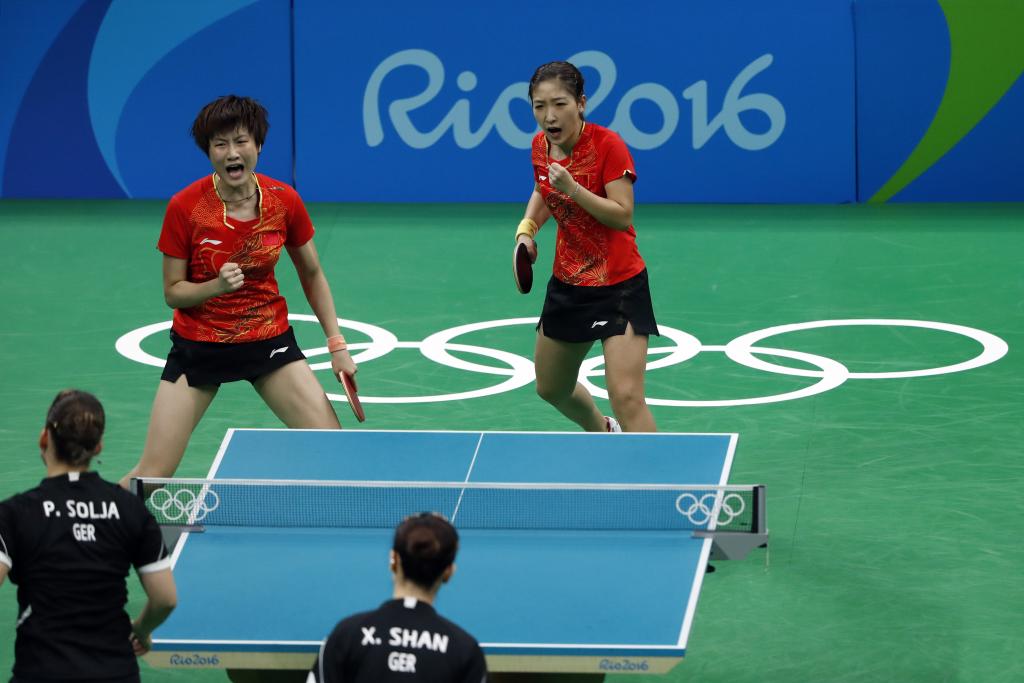 2016年8月16日,中国选手丁宁(左上)/刘诗雯(右上)得分后庆祝。 当日,在2016年里约奥运会乒乓球女子团体赛决赛中,中国队以3比0战胜德国队获得金牌。沈伯韩 摄