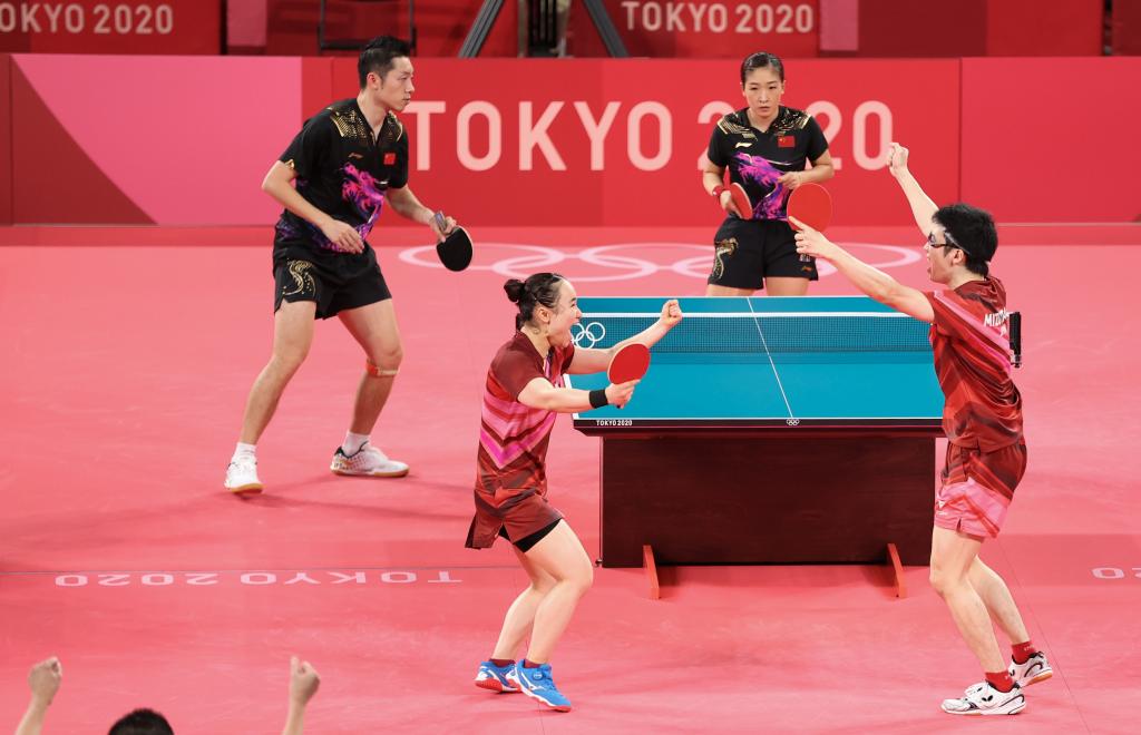 2021年7月26日,在东京奥运会乒乓球混双决赛中,中国队选手许昕/刘诗雯不敌日本队选手水谷隼/伊藤美诚,获得亚军。郑焕松 摄