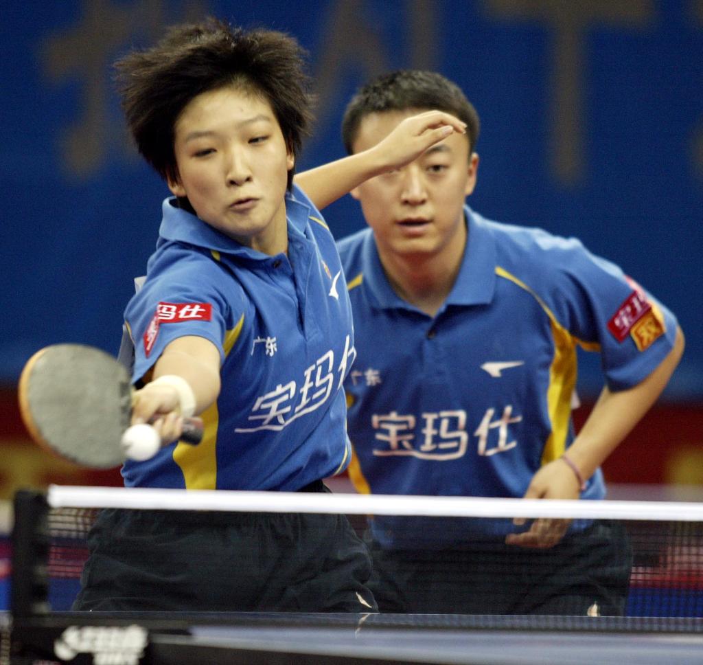 2005年10月15日,广东队选手马琳/刘诗雯(左)在第十届全国运动会乒乓球混双比赛中。最终,马琳/刘诗雯以2比3负于天津队选手郝帅/唐娜,无缘晋级。毕明明 摄