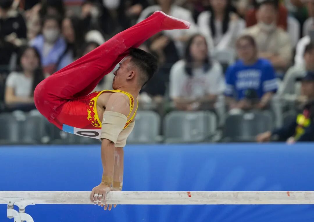 11月14日进行的十五运会体操男子全能决赛可以用紧张刺激来形容。前4轮结束,张博恒、肖若腾咬得很紧,两人只差0.166分。第5项双杠比拼,张博恒解决了雅加达世锦赛时存在的问题,发挥非常出色,这一轮又赢了肖若腾0.4分。最后一项单杠肖若腾先登场,他完成了一个优质套,落地稳稳钉住。张博恒手握0.566分的优势,如果优势更大一些,他可以选择战术性降难度来保金牌,但这个不算大的优势恰恰成了一种有可能影响心理状态的存在。最终张博恒在杠上出现了脱手,虽然没有掉杠,但损失了不少完成分。肖若腾以总分84.531分蝉联冠军,赢了张博恒1.134分。