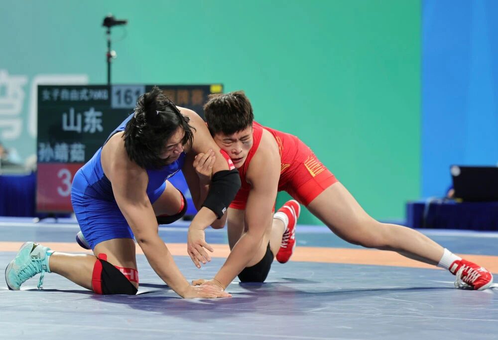 这场比赛是一次象征性的“新老交接”。作为十五运会女子自由式摔跤参赛年龄最大的选手,周倩曾在5个月前的资格赛中战胜过孙靖茹,如今铜牌赛胜负易位。
