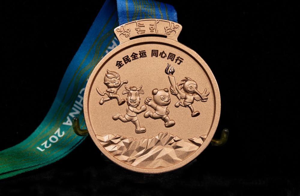 第十四届全运会奖牌直径8cm,厚0.8cm。奖牌正面将本届全运会会徽作为主元素,周围环绕赛事的中英文名称。奖牌背面运用浮雕工艺,将全运会吉祥物——秦岭四宝的形象与秦岭山脉结合,上方环绕主题口号“全民全运 同心同行”。奖牌与绶带的连接处采用卡扣设计,提取了我国国宝级文物“何尊”上的“中国”纹样。奖牌整体设计简约、大气、庄重,体现出第十四届全运会的办赛理念和主办城市陕西深厚的历史文化底蕴。
