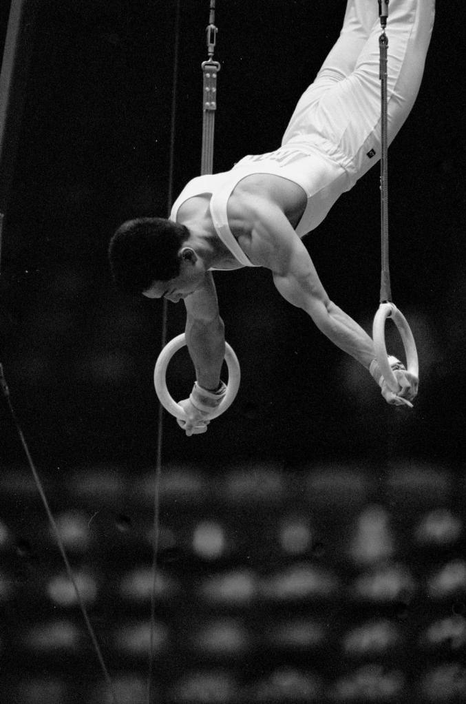 1993年9月3日,山西选手张文在第七届全国运动会男子体操团体赛吊环比赛中。程至善 摄