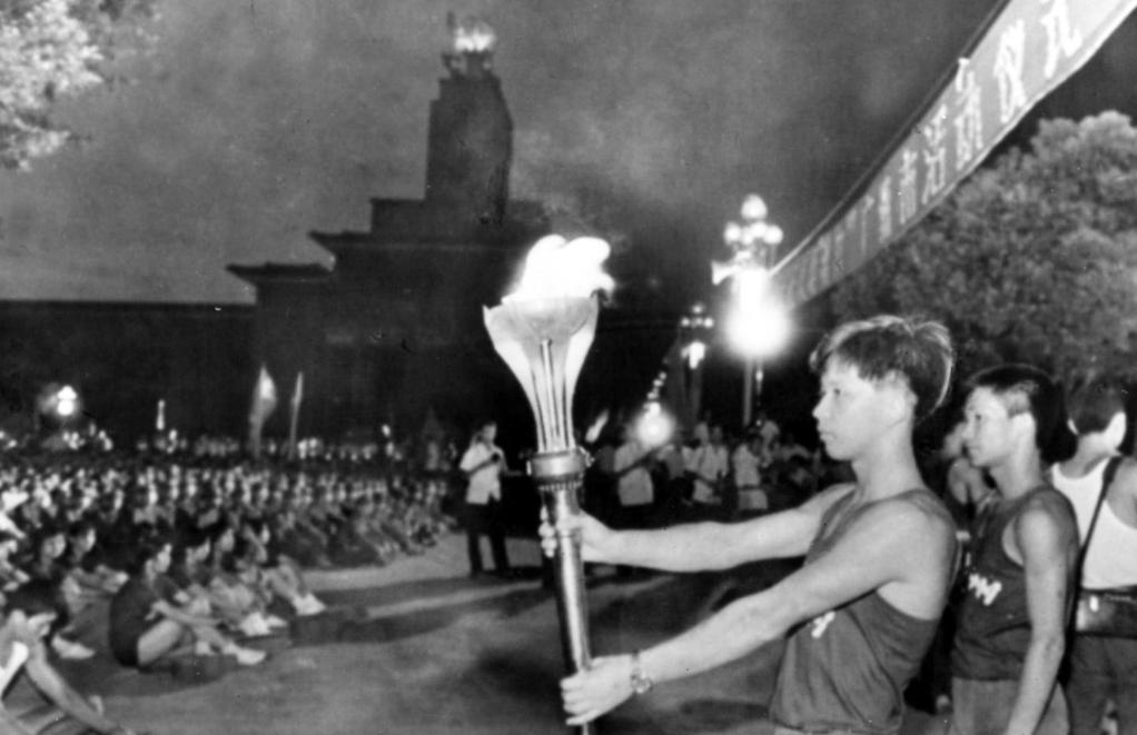 1979年9月15日,第四届全国运动会开幕式在北京举行。这是7月20日,新长征火炬接力队伍到达广州。广州市一万多名群众在广州农民运动讲习所广场参加了火炬交接仪式并举行环城接力赛跑。张赫嵩 摄