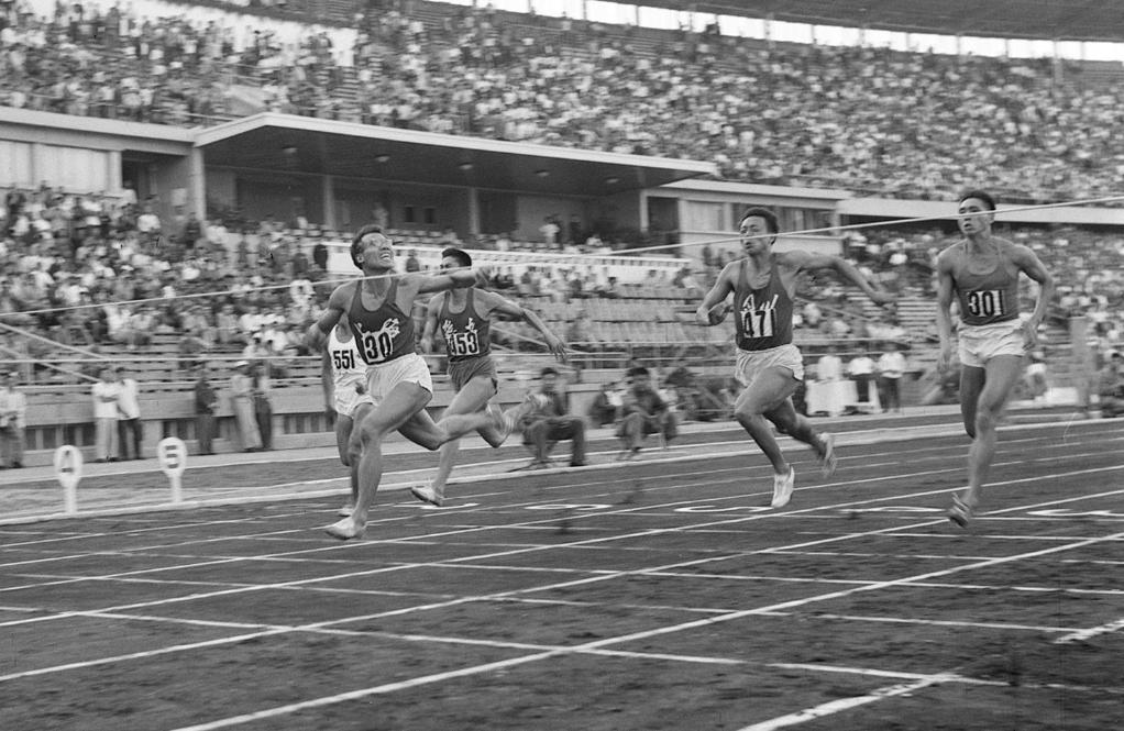1965年9月13日,第二届全国运动会田径比赛中,上海选手刘庆封(前左)获得男子100米赛跑第一名。李子青 摄