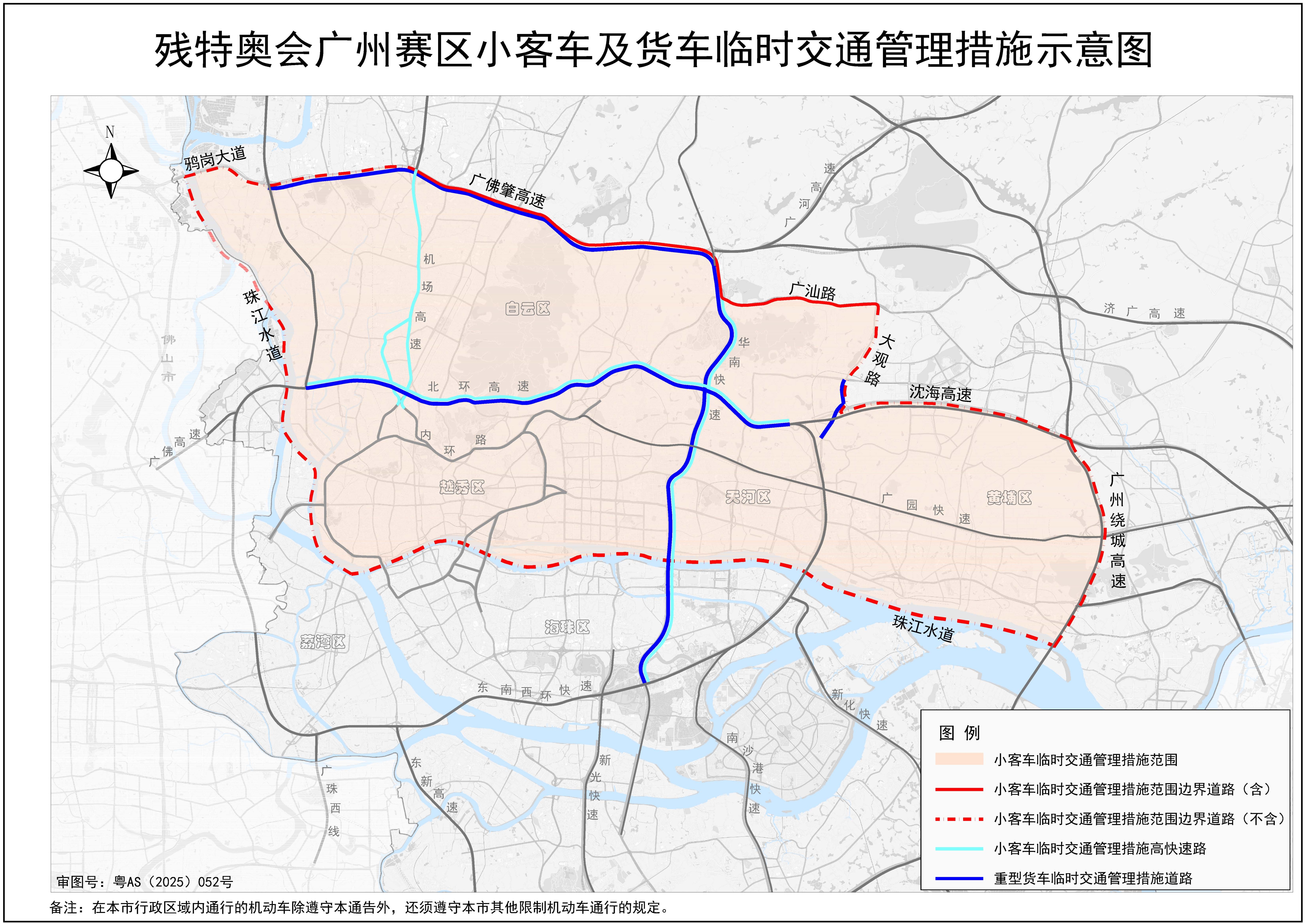 十五运会和残特奥会期间(除11月9日外),在现有市区货车限行措施基础上,增加每日7时至22时禁止重型货车通行广佛肇高速、华南快速干线、沈海高速广州支线北环段、大观路的临时管理措施。