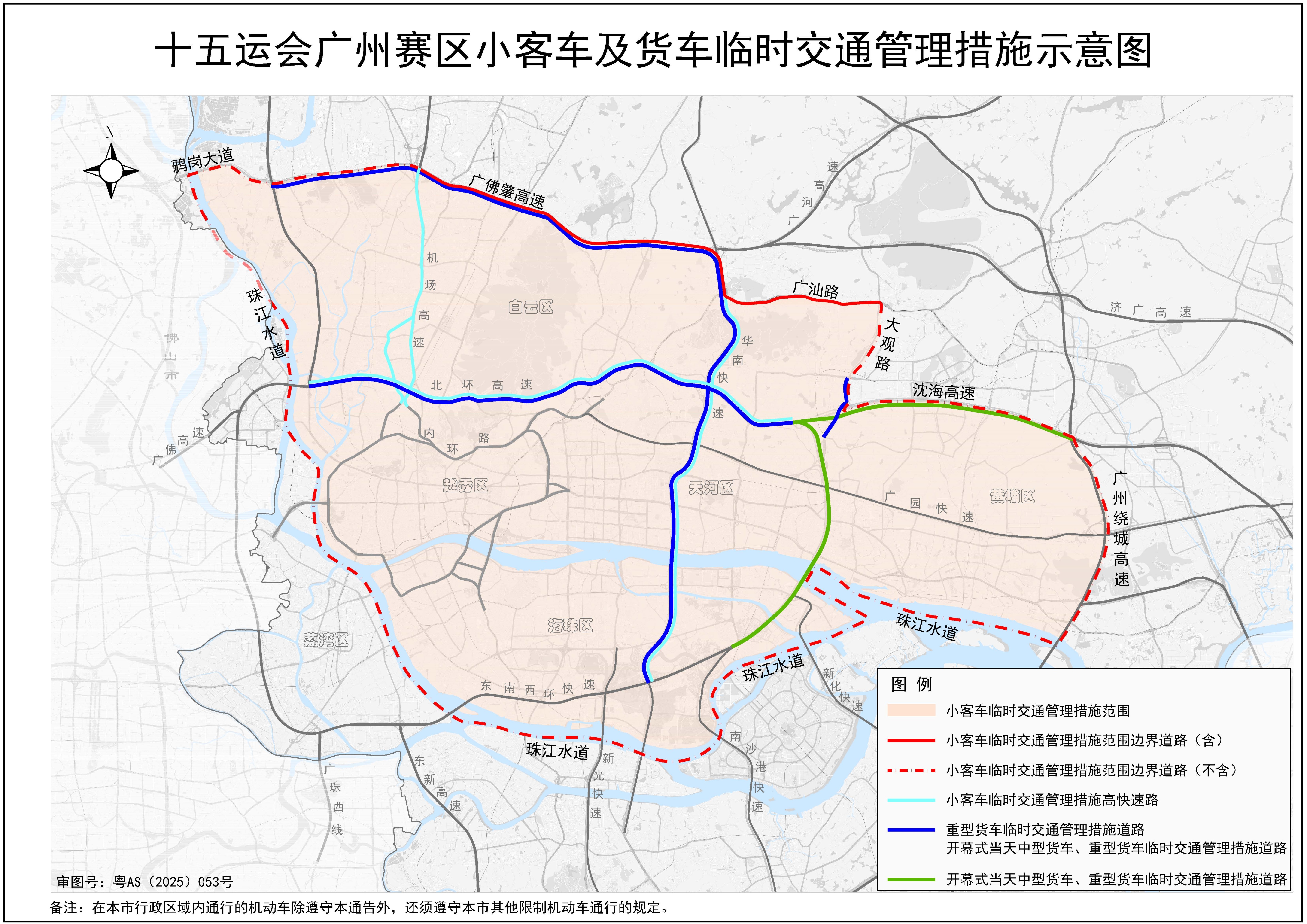十五运会开幕式(11月9日)当天,在现有市区货车限行措施基础上,增加7时至24时禁止中型、重型货车通行广佛肇高速、华南快速干线、沈海高速广州支线北环段、大观路、沈海高速广州支线广深段、东南西环城市快速路的临时管理措施。
