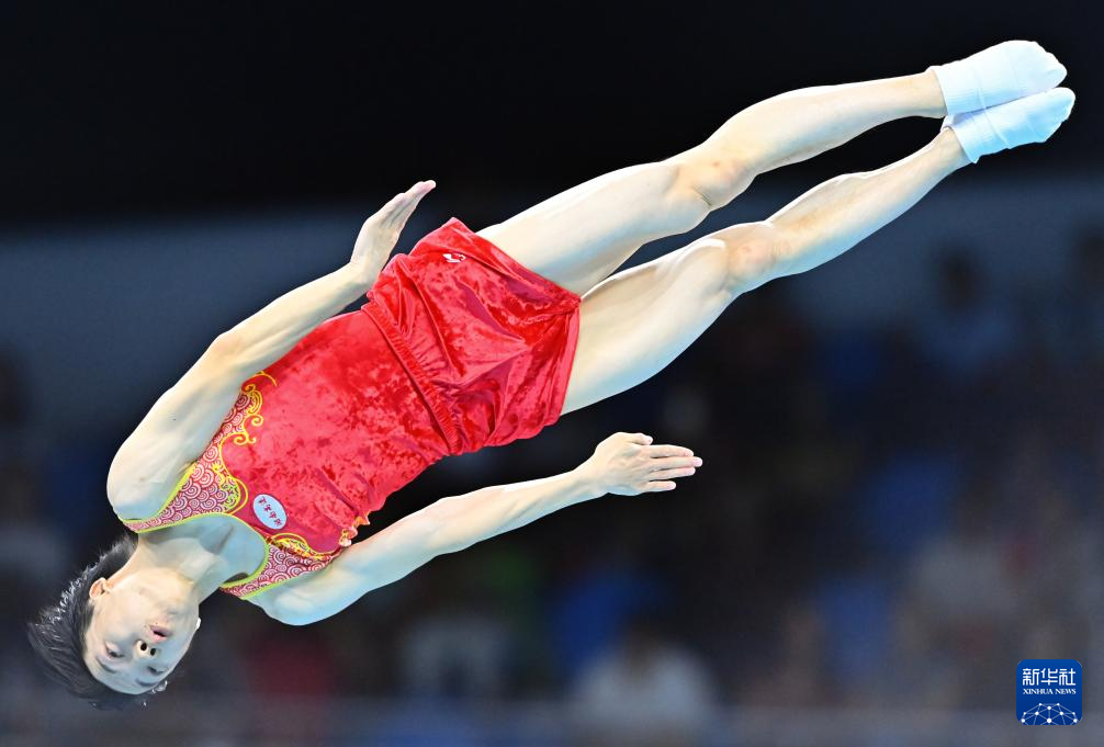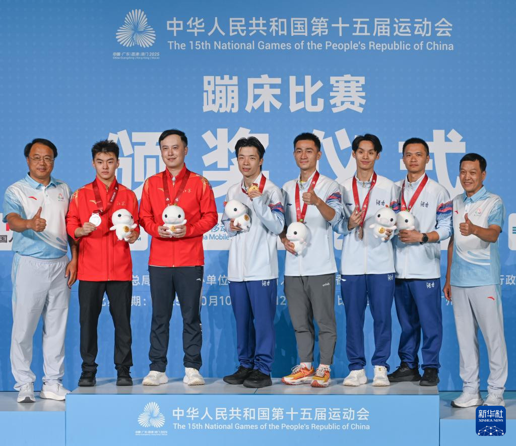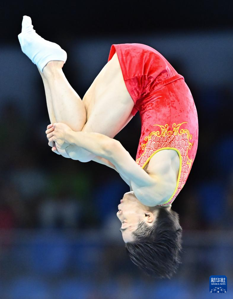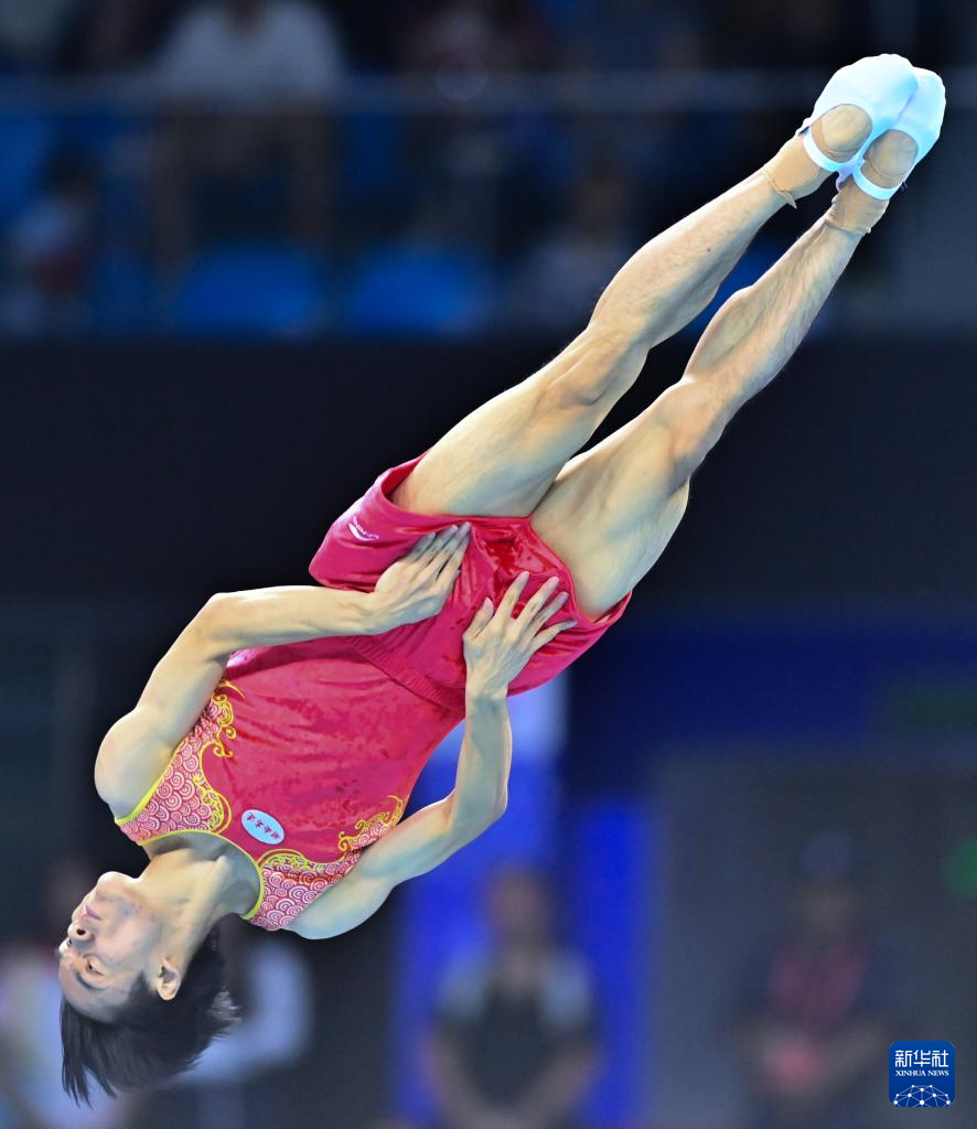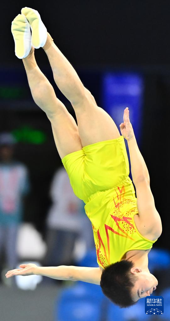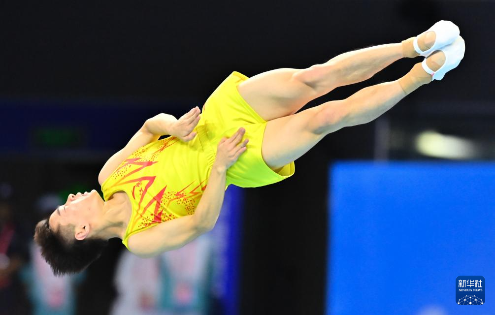 当日,第十五届全运会蹦床男子个人决赛在广州体育馆举行。