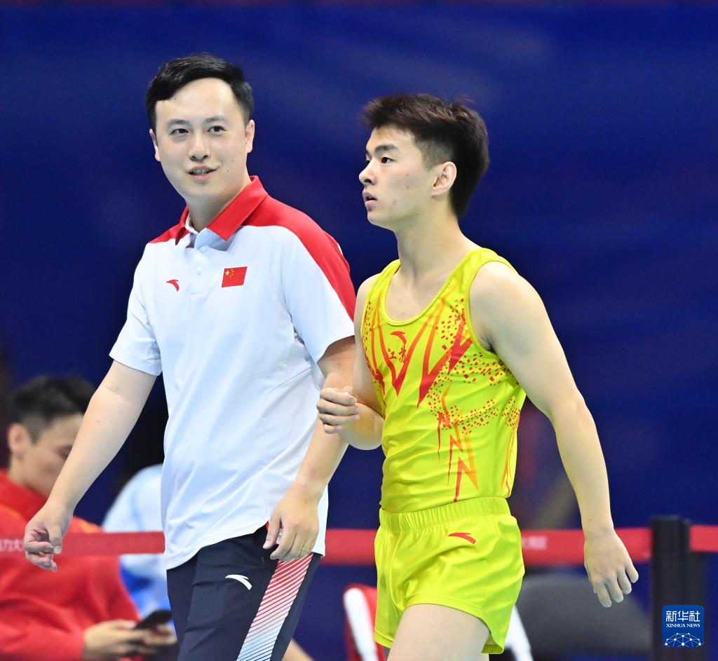 10月12日,江苏队选手王梓赛(右)与教练在比赛后。最终,他获得亚军。