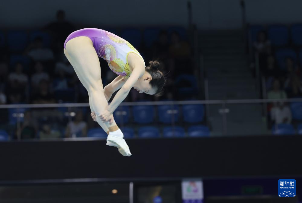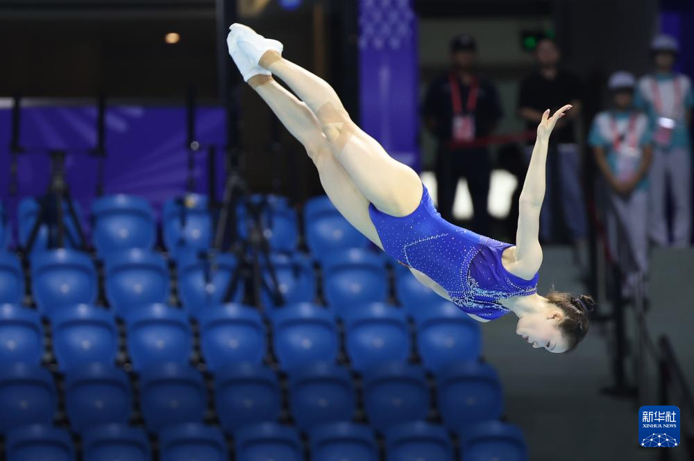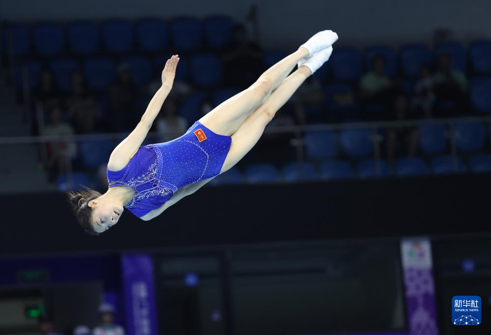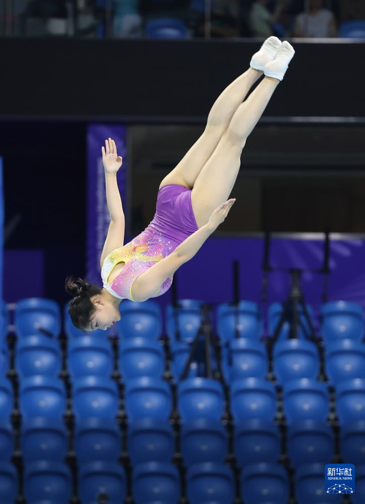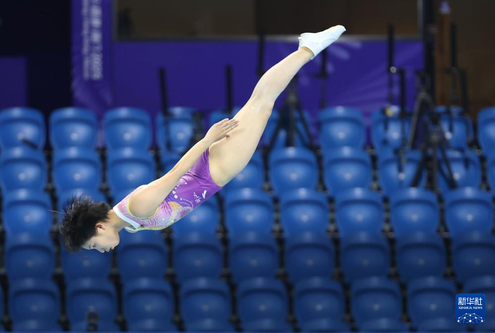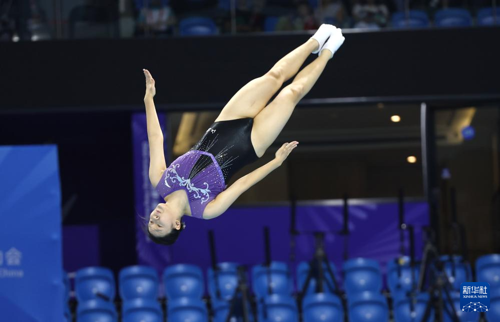 10月11日,浙江队队员石馨怡在比赛中。最终,浙江队获得亚军。当日,第十五届全运会蹦床女子团体决赛在广州举行。