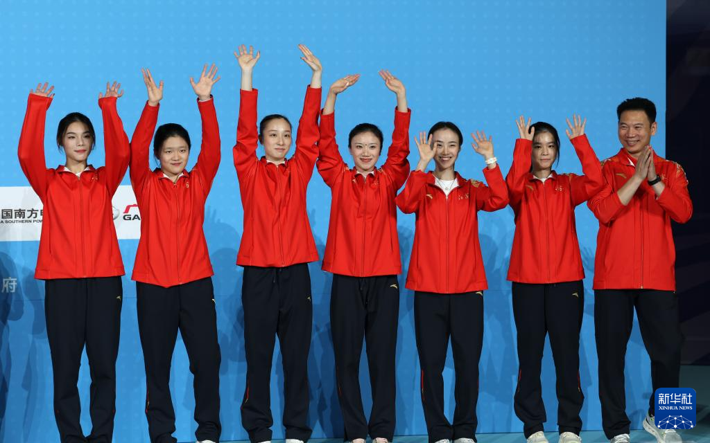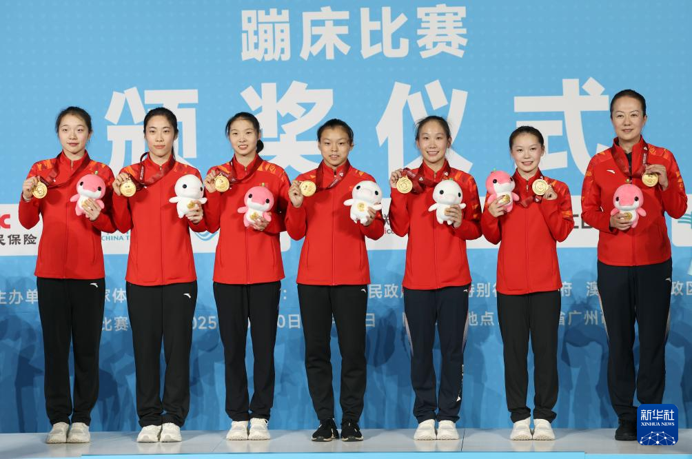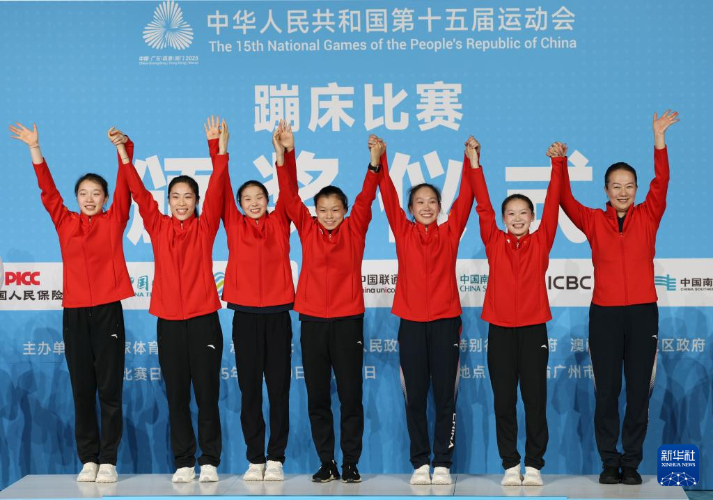 10月11日,冠军山西队队员在颁奖仪式上。当日,第十五届全运会蹦床女子团体决赛在广州举行。