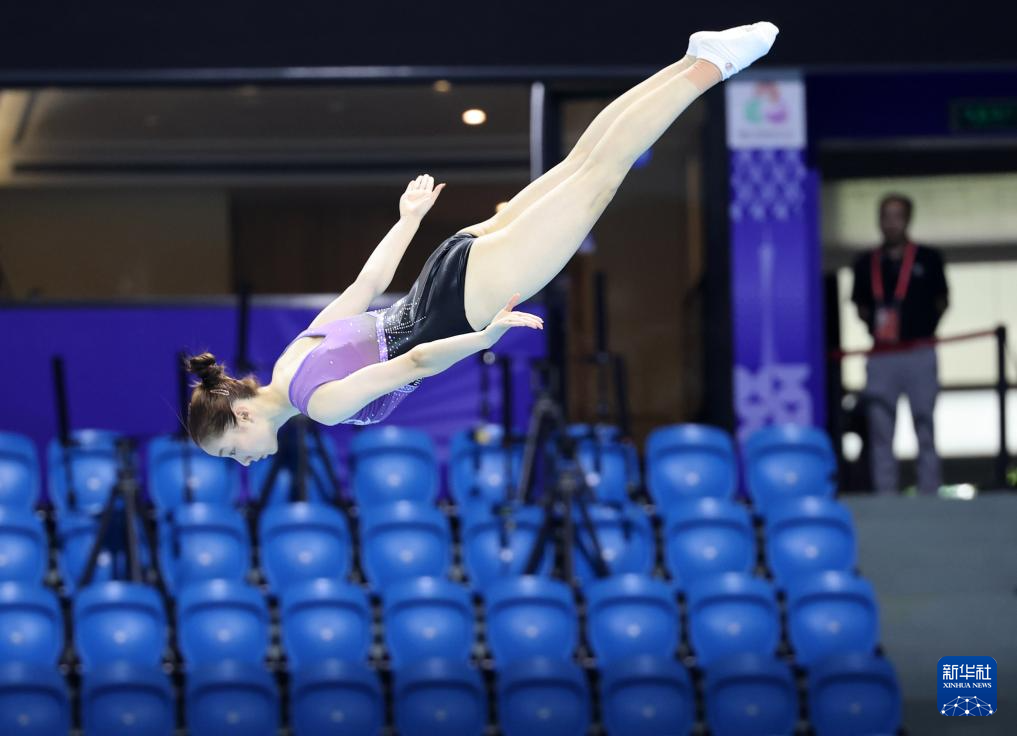 10月11日,浙江队队员范心怡在比赛中。最终,浙江队获得亚军。当日,第十五届全运会蹦床女子团体决赛在广州举行。