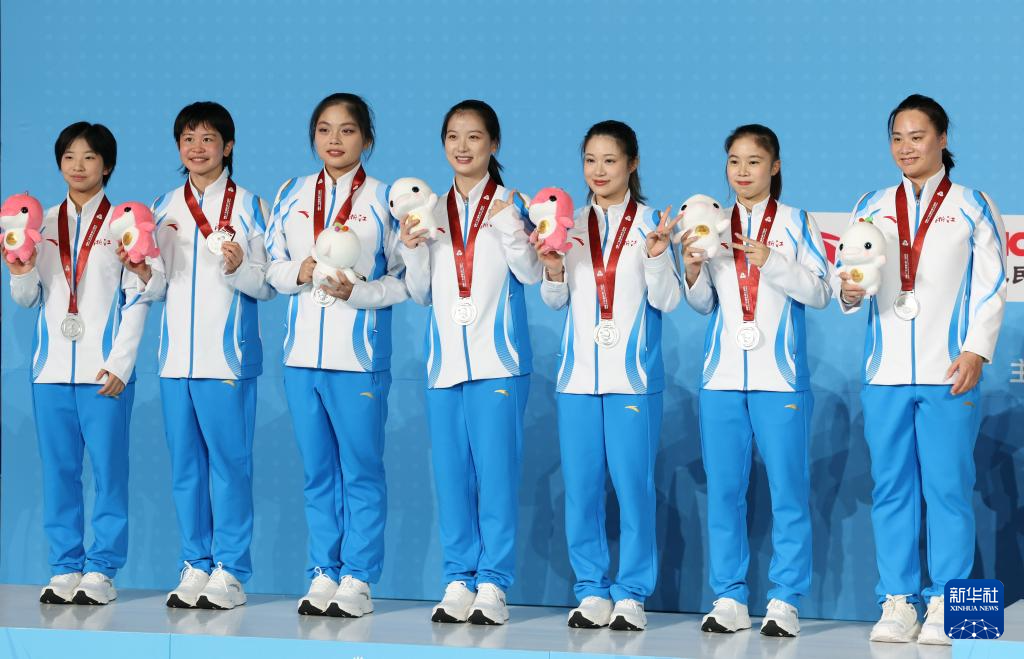 10月11日,亚军浙江队队员在颁奖仪式上。当日,第十五届全运会蹦床女子团体决赛在广州举行。
