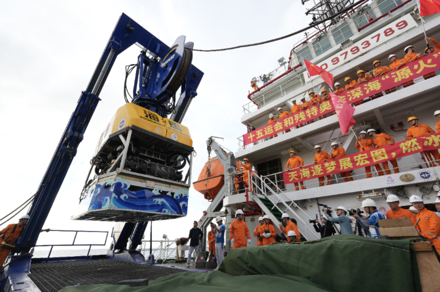 “海马”号深海遥控潜水器携“源火”出水