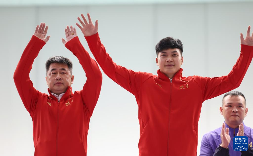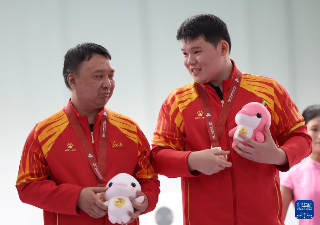 10月13日,季军江西队选手王仕文(右)和教练在颁奖仪式上。