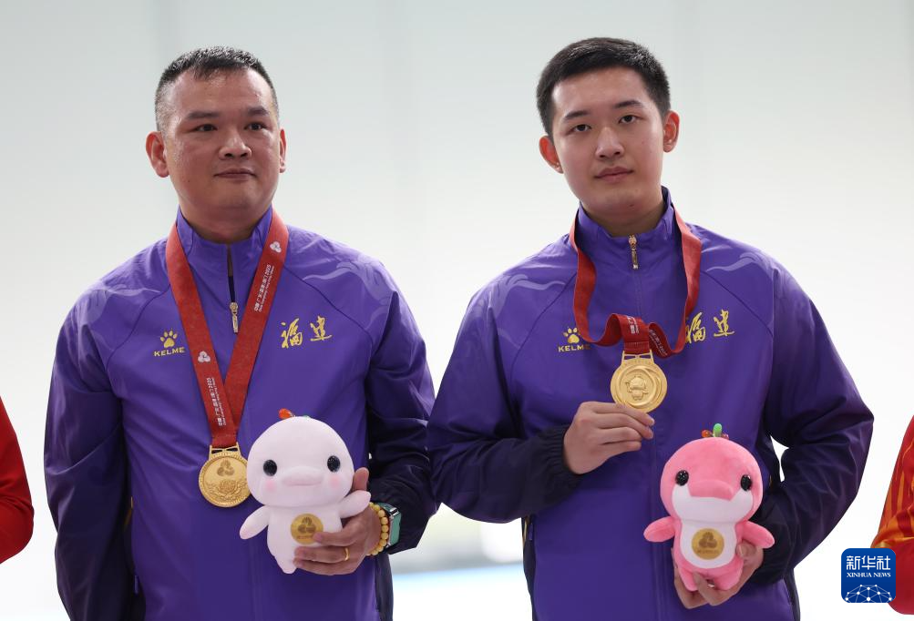 10月13日,冠军福建队选手苏连博凡(右)和教练在颁奖仪式上。