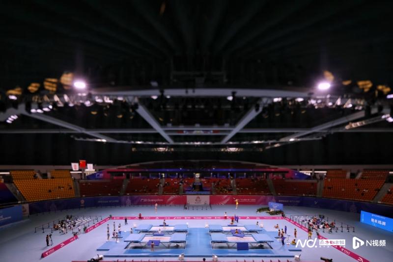 10月10日,十五运会蹦床项目正赛在广州体育馆开赛,来自全国的13支队伍共118名运动员将在为期三天的比赛中角逐男女团体和个人四枚金牌。