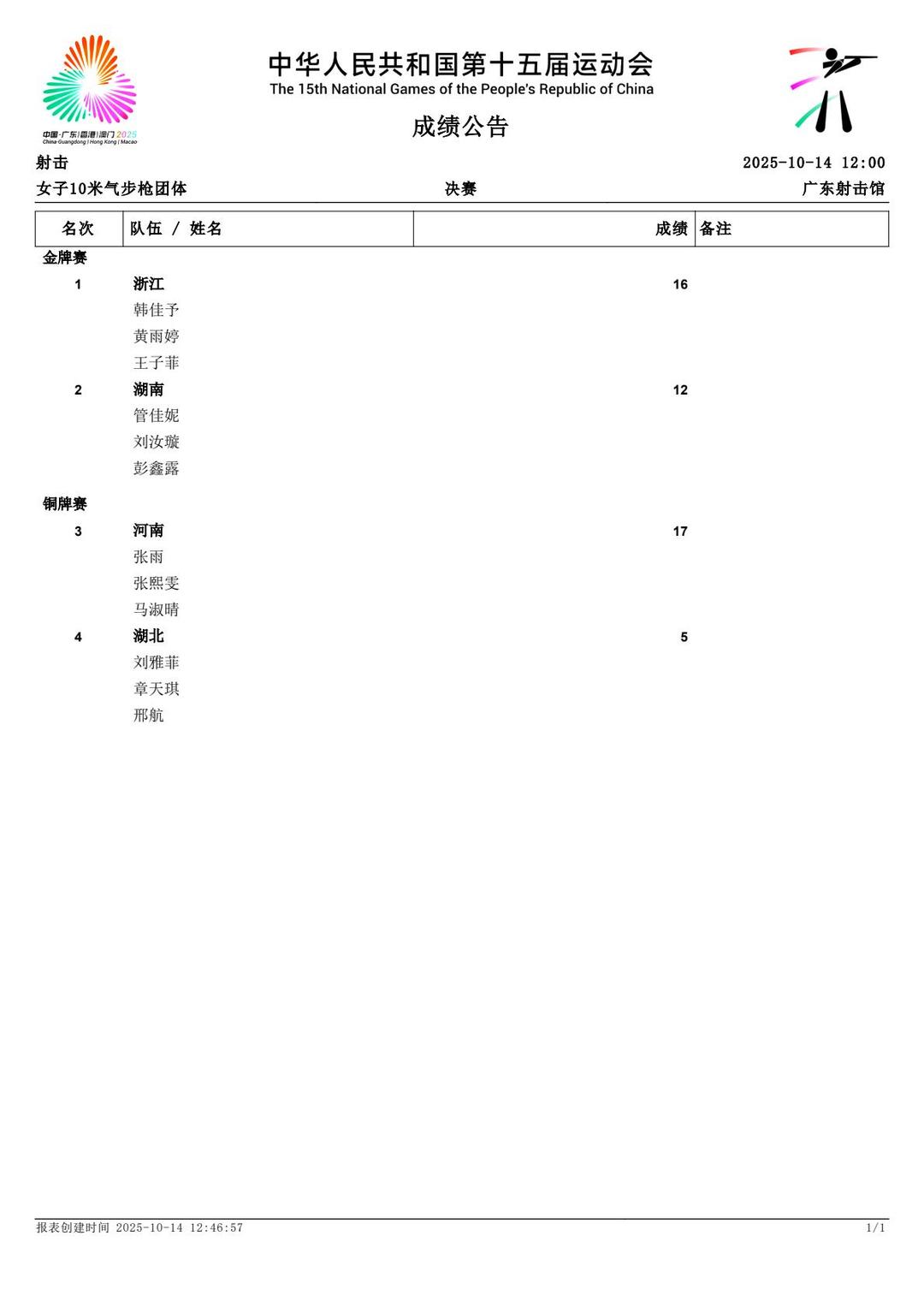 【赛事成绩】第十五届全国运动会射击女子10米气步枪团体决赛成绩公告(10月14日)