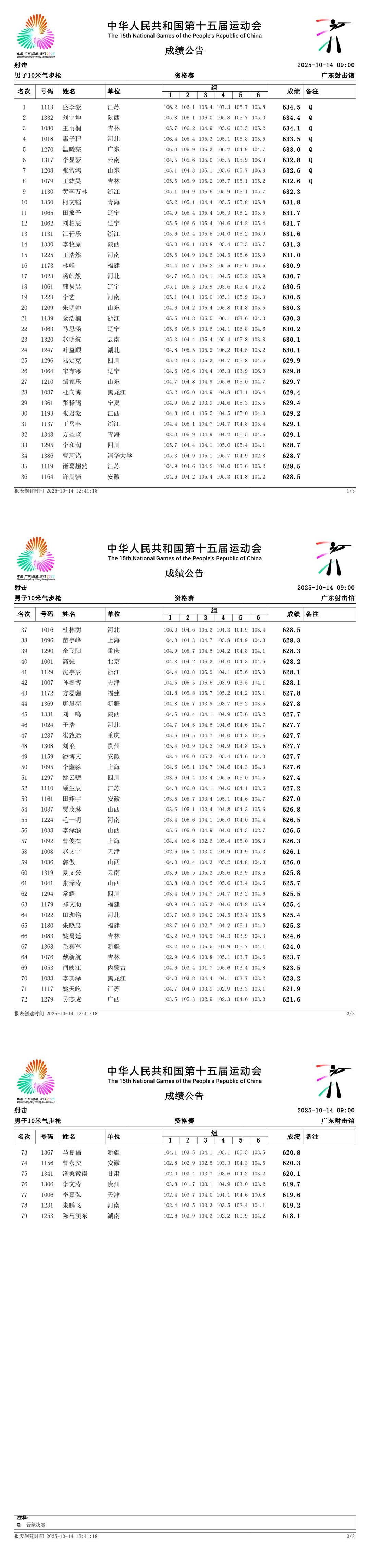 【赛事成绩】第十五届全国运动会射击男子10米气步枪资格赛成绩公告(10月14日)