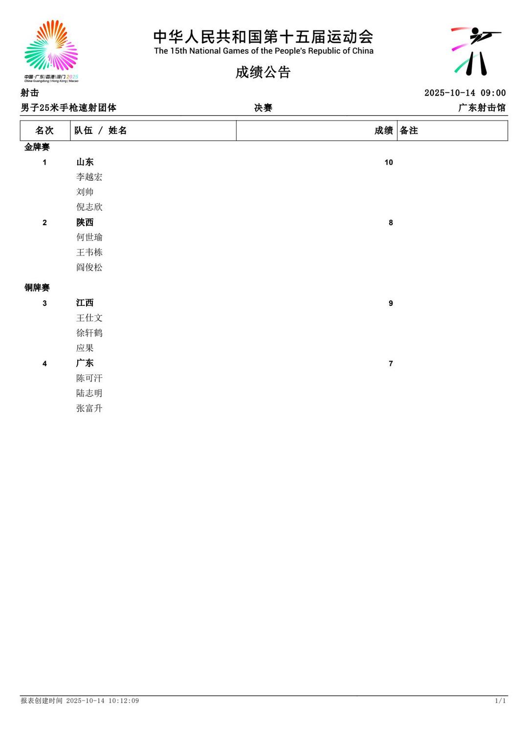 【赛事成绩】第十五届全国运动会射击男子25米手枪速射团体决赛成绩公告(10月14日)
