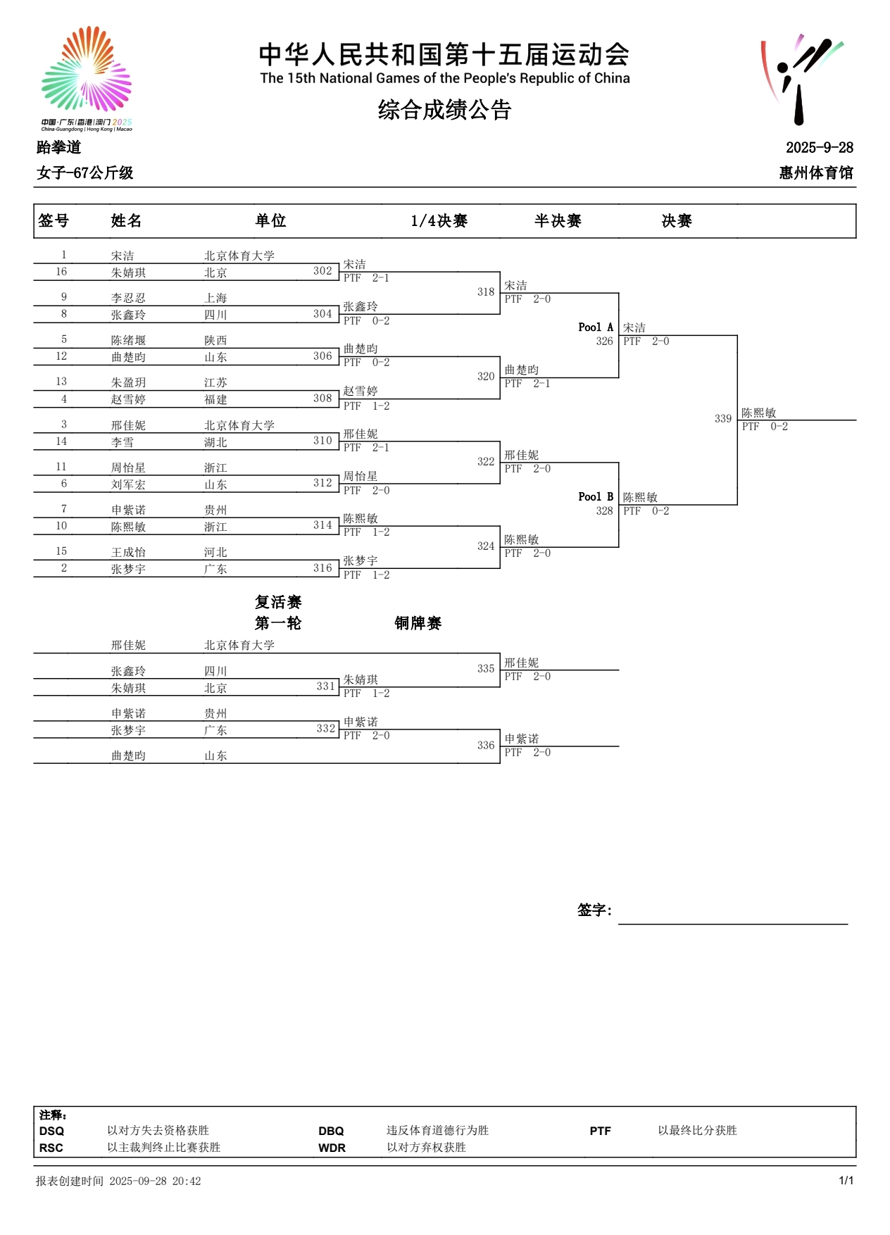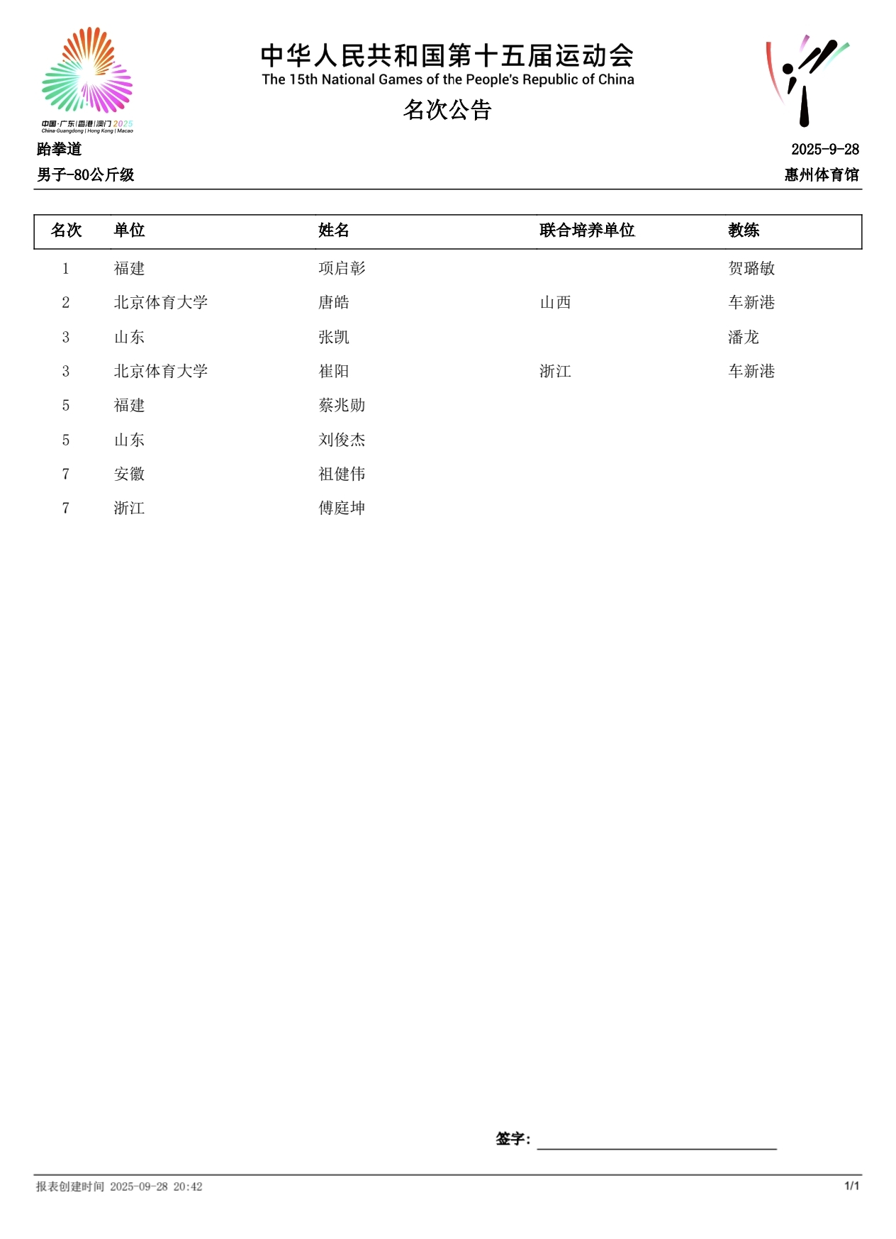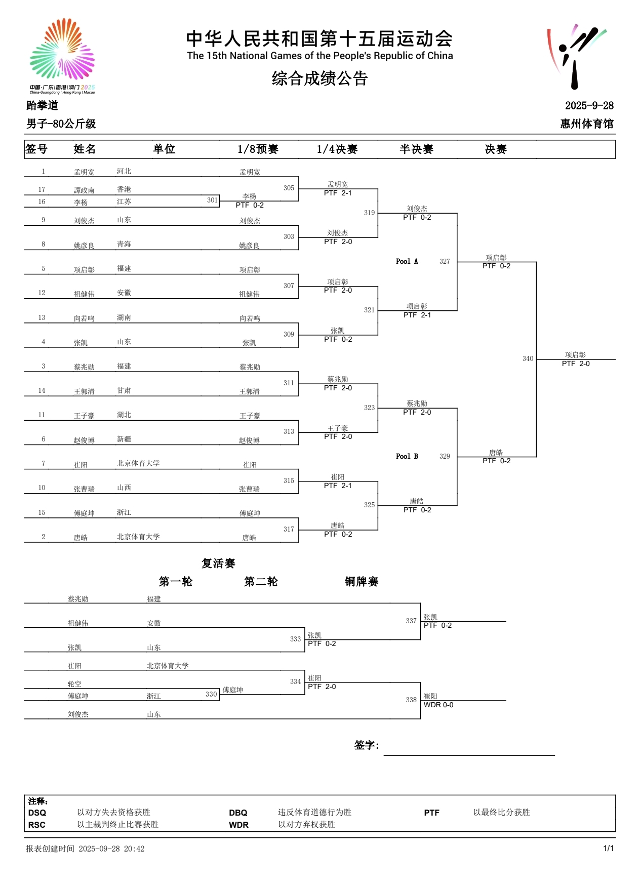 第十五届全国运动会跆拳道成绩公告(9月28日)
