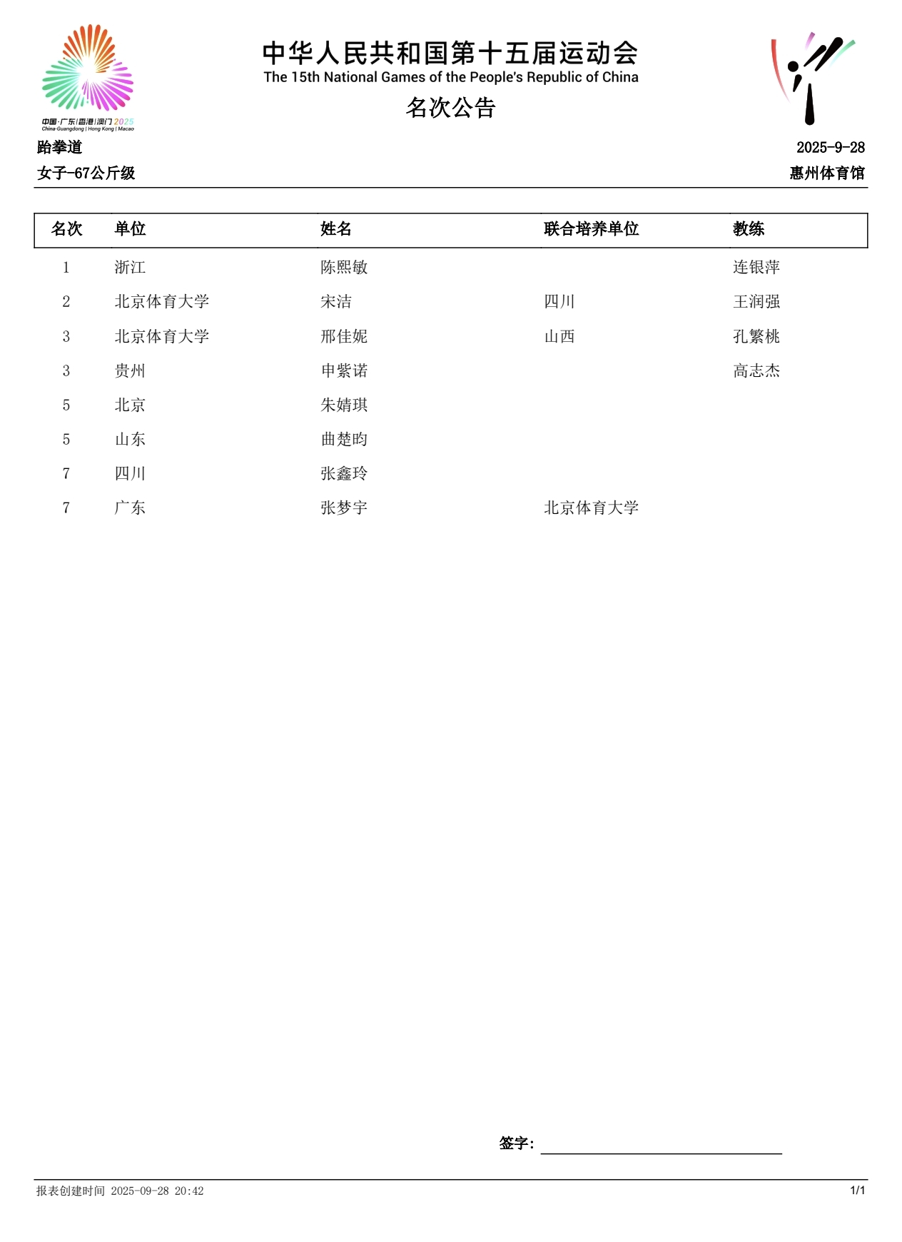【赛事成绩】第十五届全国运动会跆拳道成绩公告(9月28日)